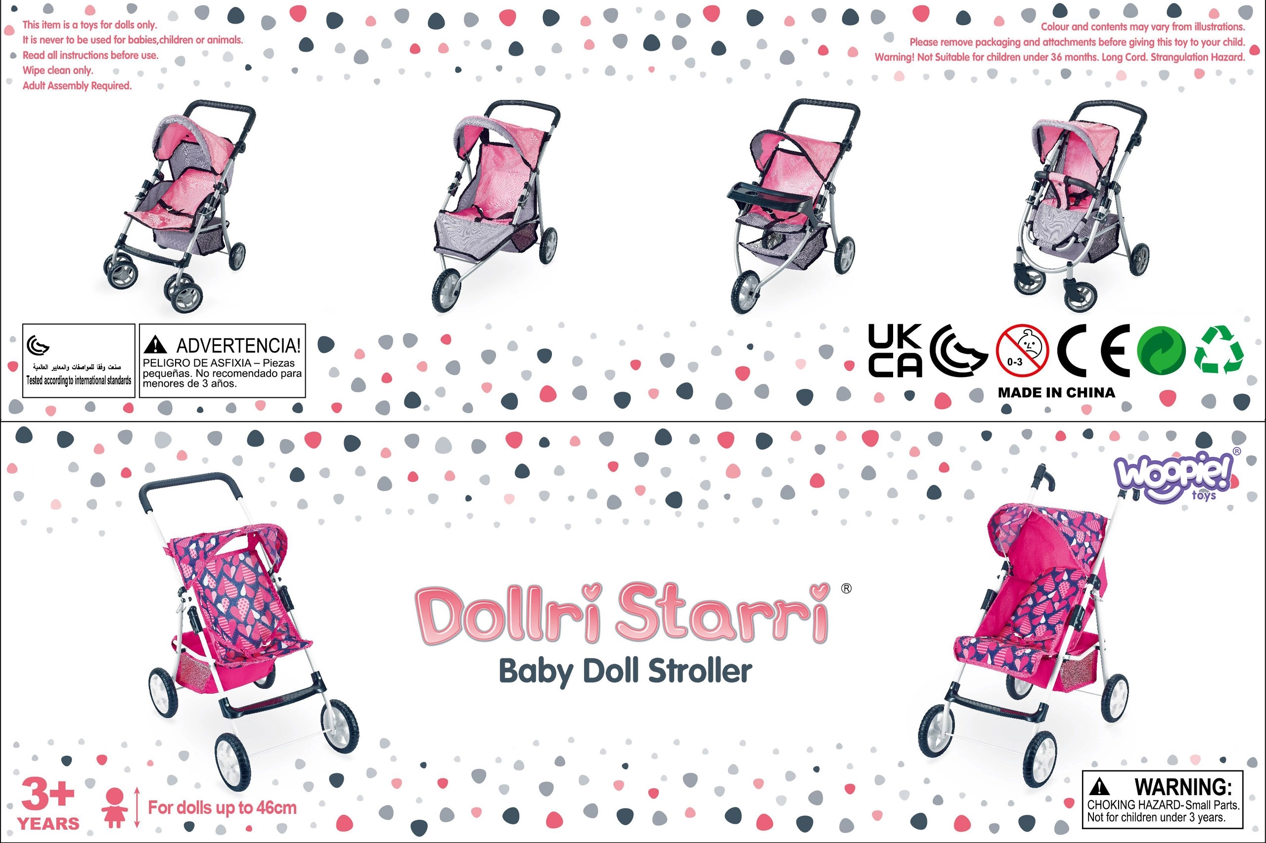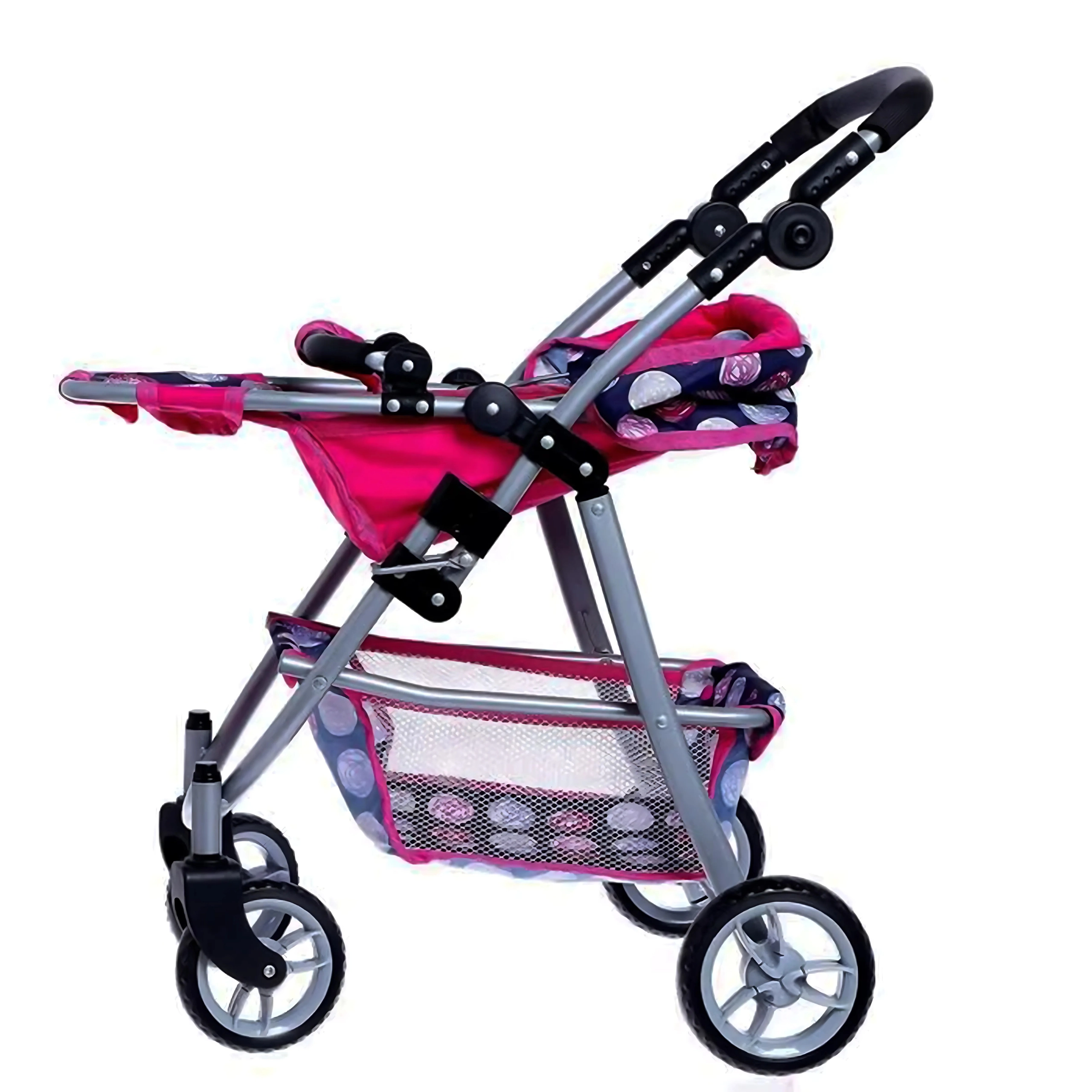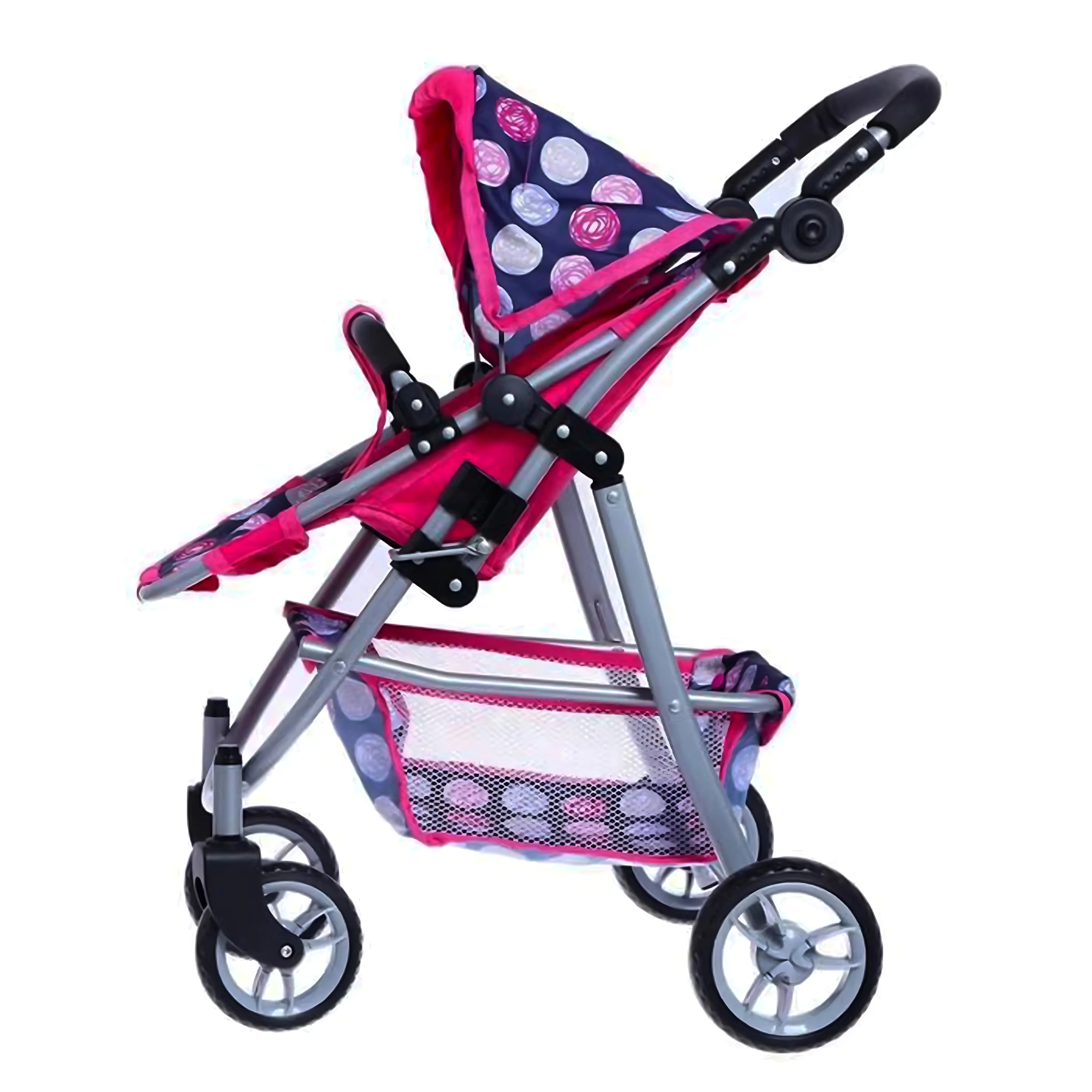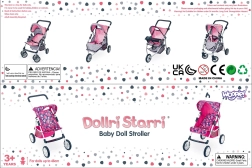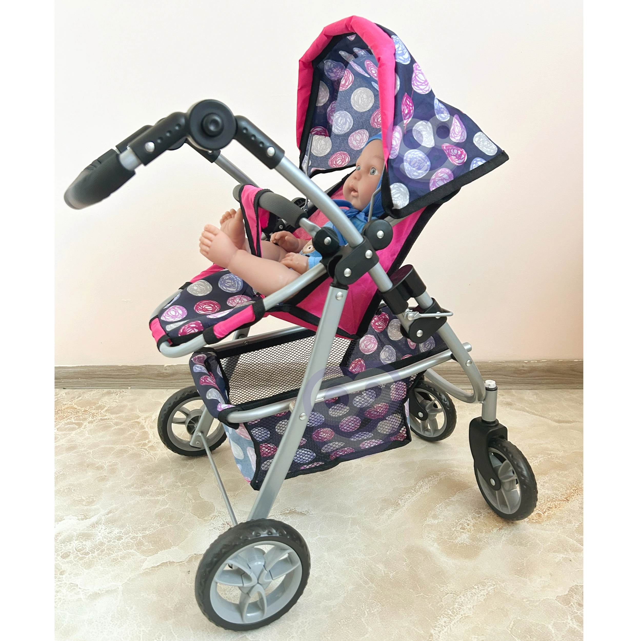 Vieglā, bet stabilā metāla konstrukcija ar mīgu rokturi ir saudzīga bērnu rokām. Ietilpīgais tekstila grozs zem sēdeklīša ietilpinās visas nepieciešamās lietas – pudelīti, sedziņu un sīkus aksesuārus. Saliekamā jumtiņa pasargā lelli “saulītē”, un ratus ir viegli novietot glabāšanā.