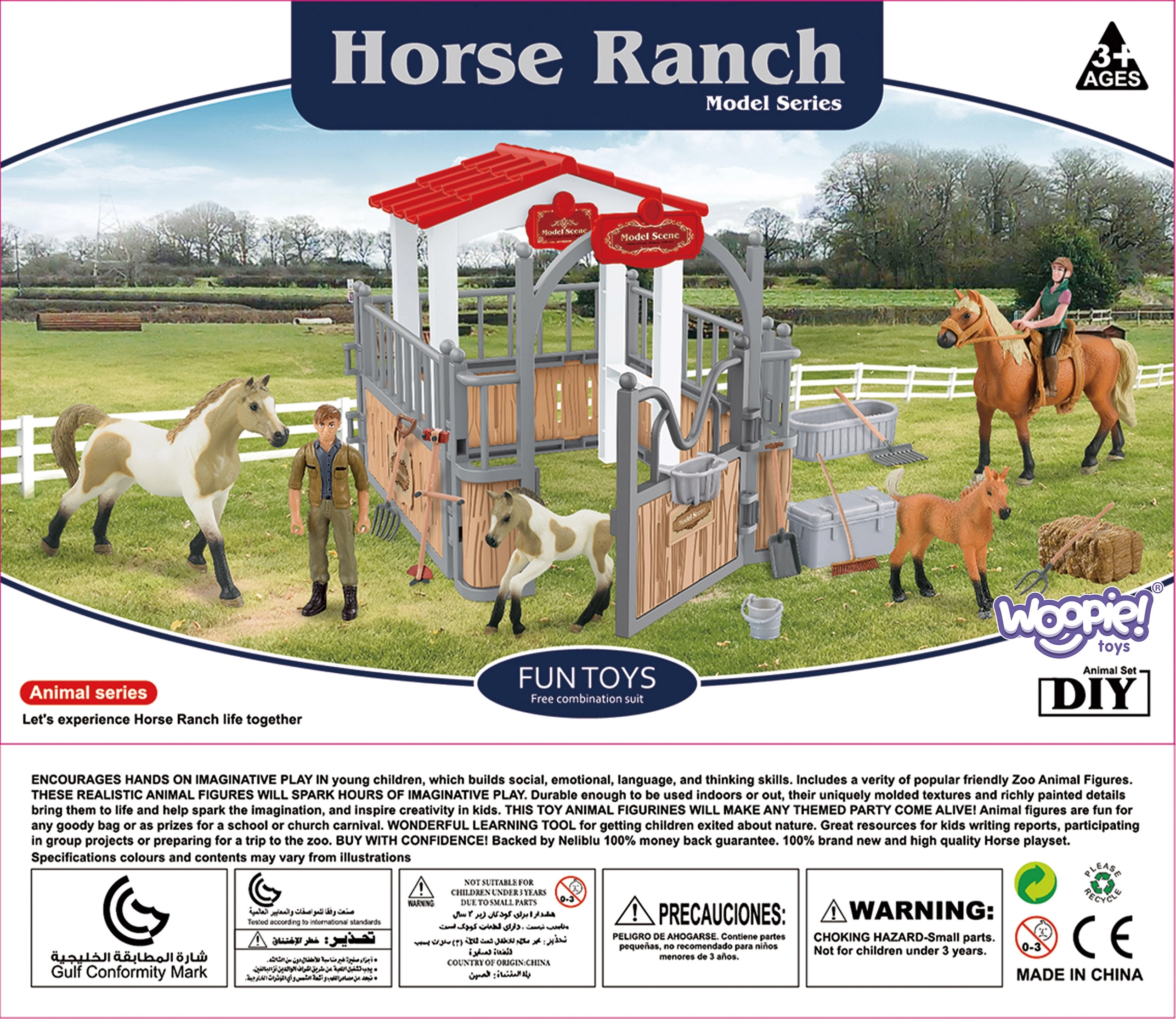 Atklājiet radošo lauku pasauli ar Woopie stallī un zirgu aploku. Iepakojumā atradīsiet 2 zirgu figūriņas, jātnieci, sienu un praktiskus piederumus zirgu kopšanai. Stallis ir klasiskā stilā, detalizēti izstrādāts, un atsevišķie elementi ir ļoti izturīgi. Spēle veicina bērnu iztēli un radošumu un attīsta saikni ar dabu.