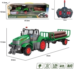 - RC traktors ar akumulatoru, piekabe ar 5 baļķiem, USB lādētājs, tālvadības pults