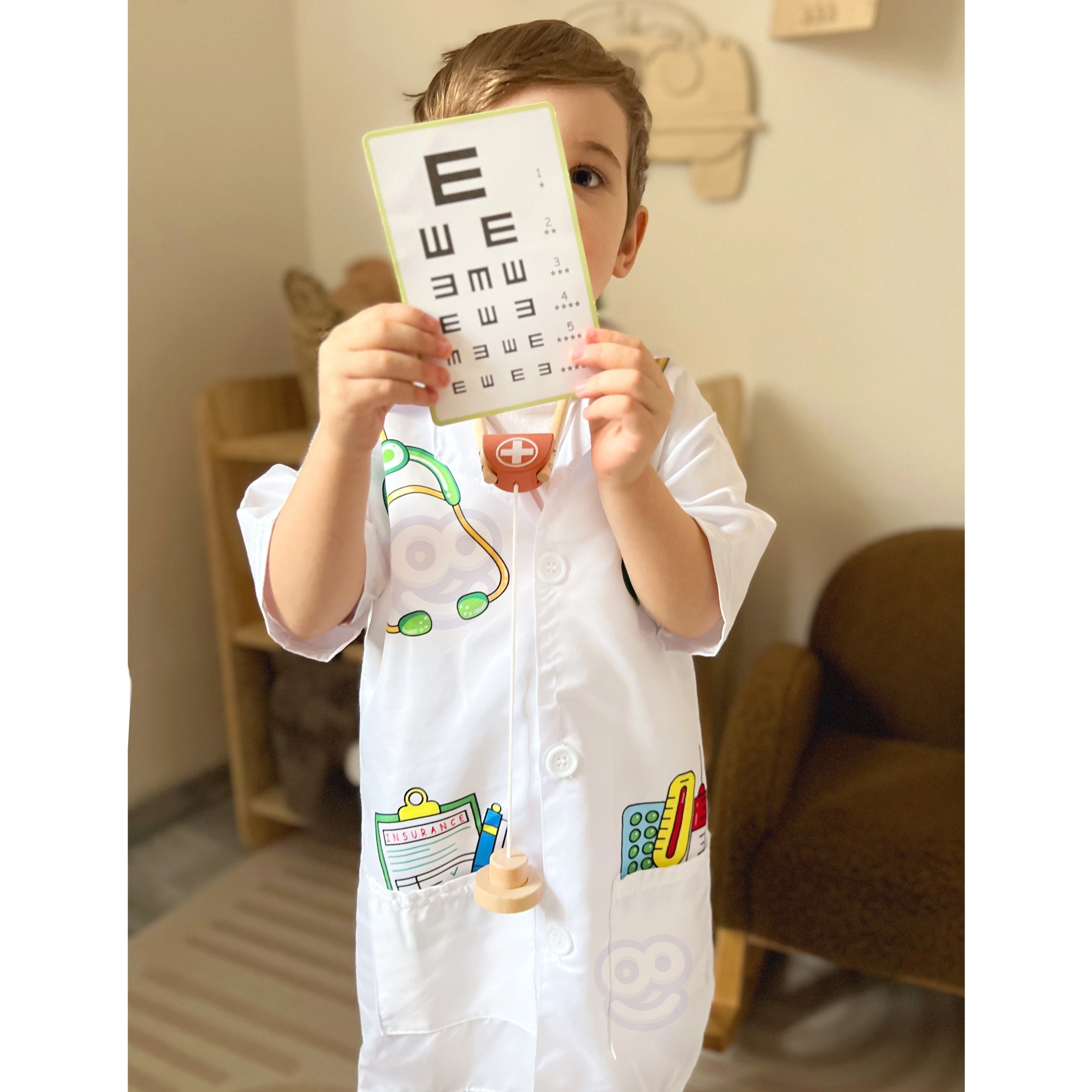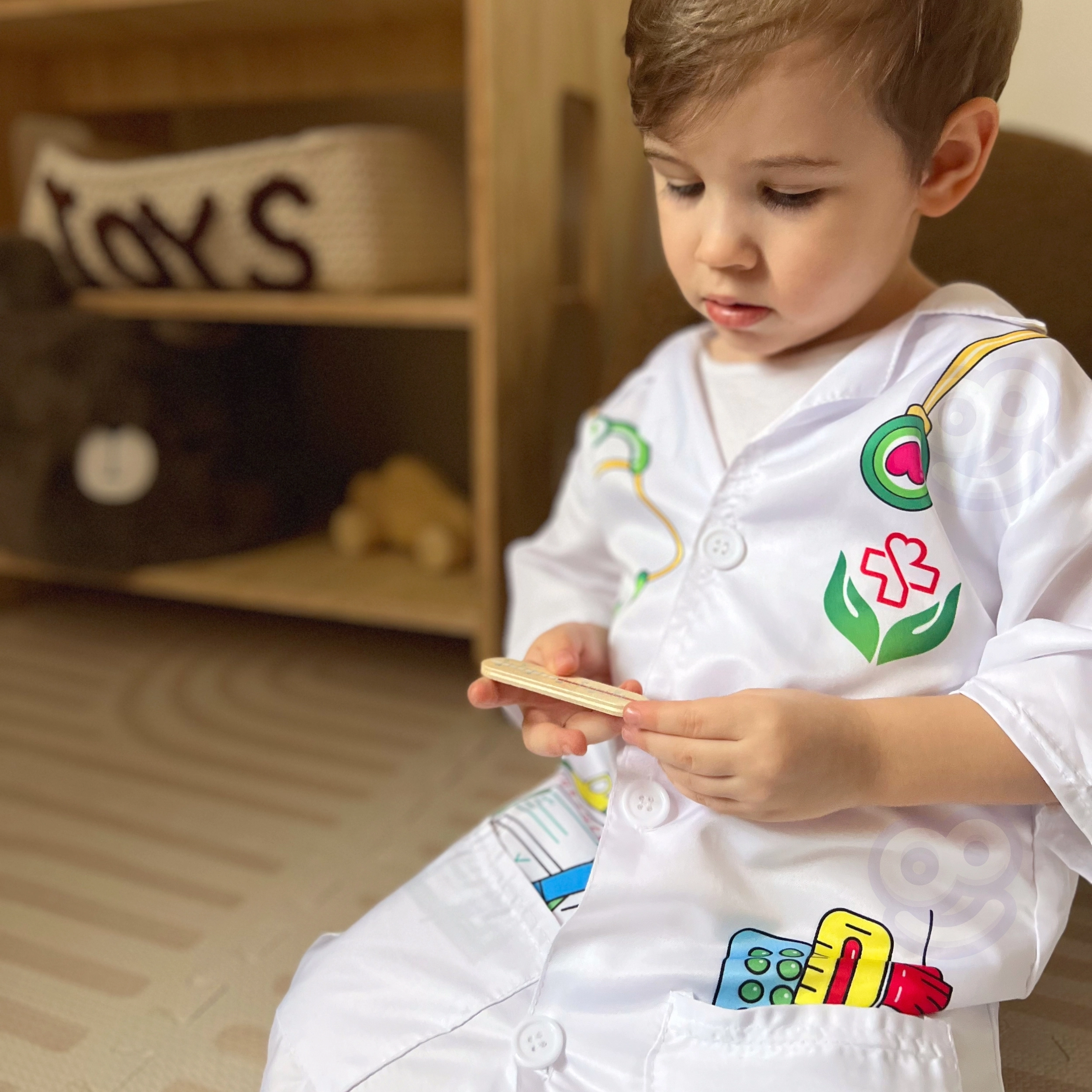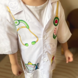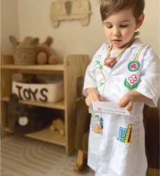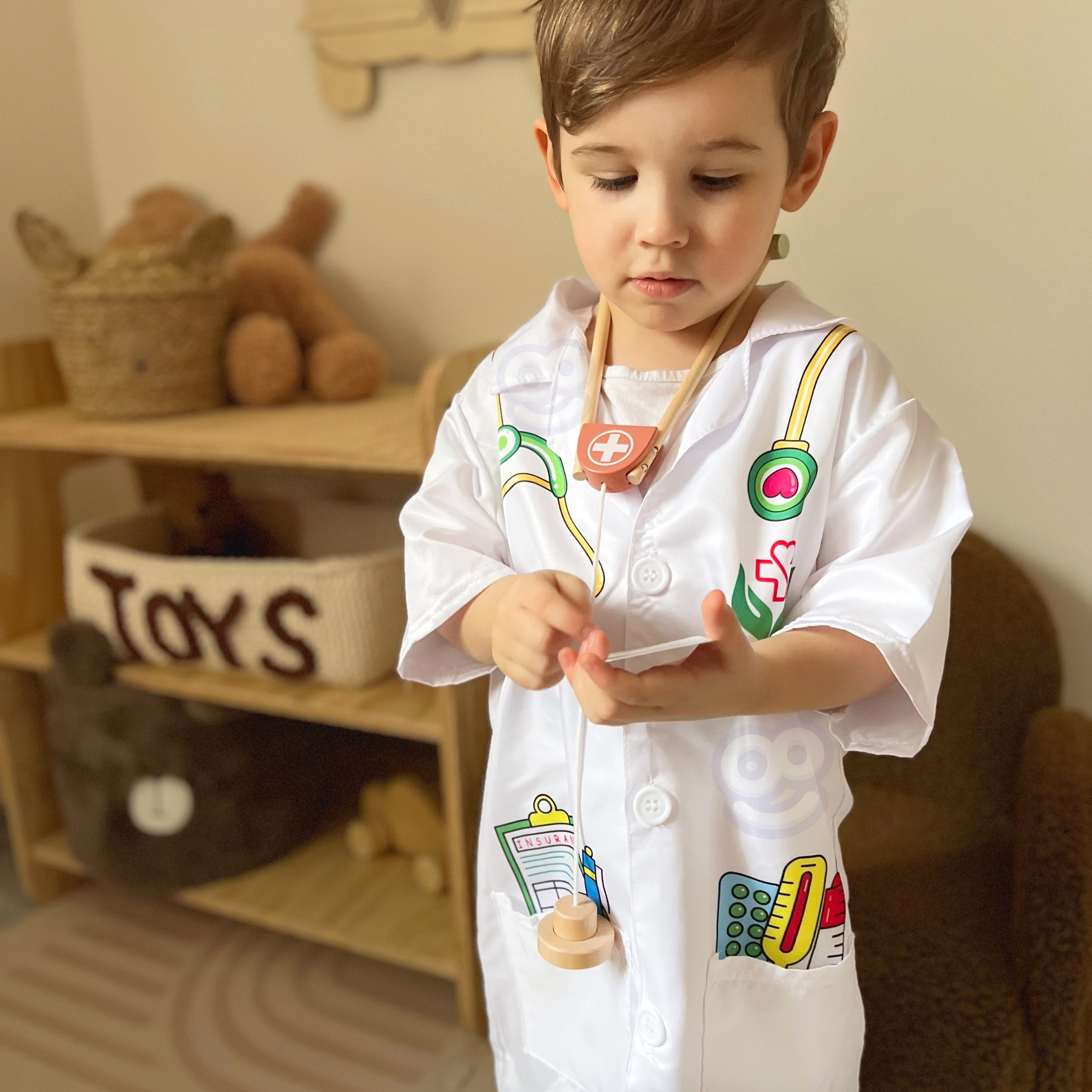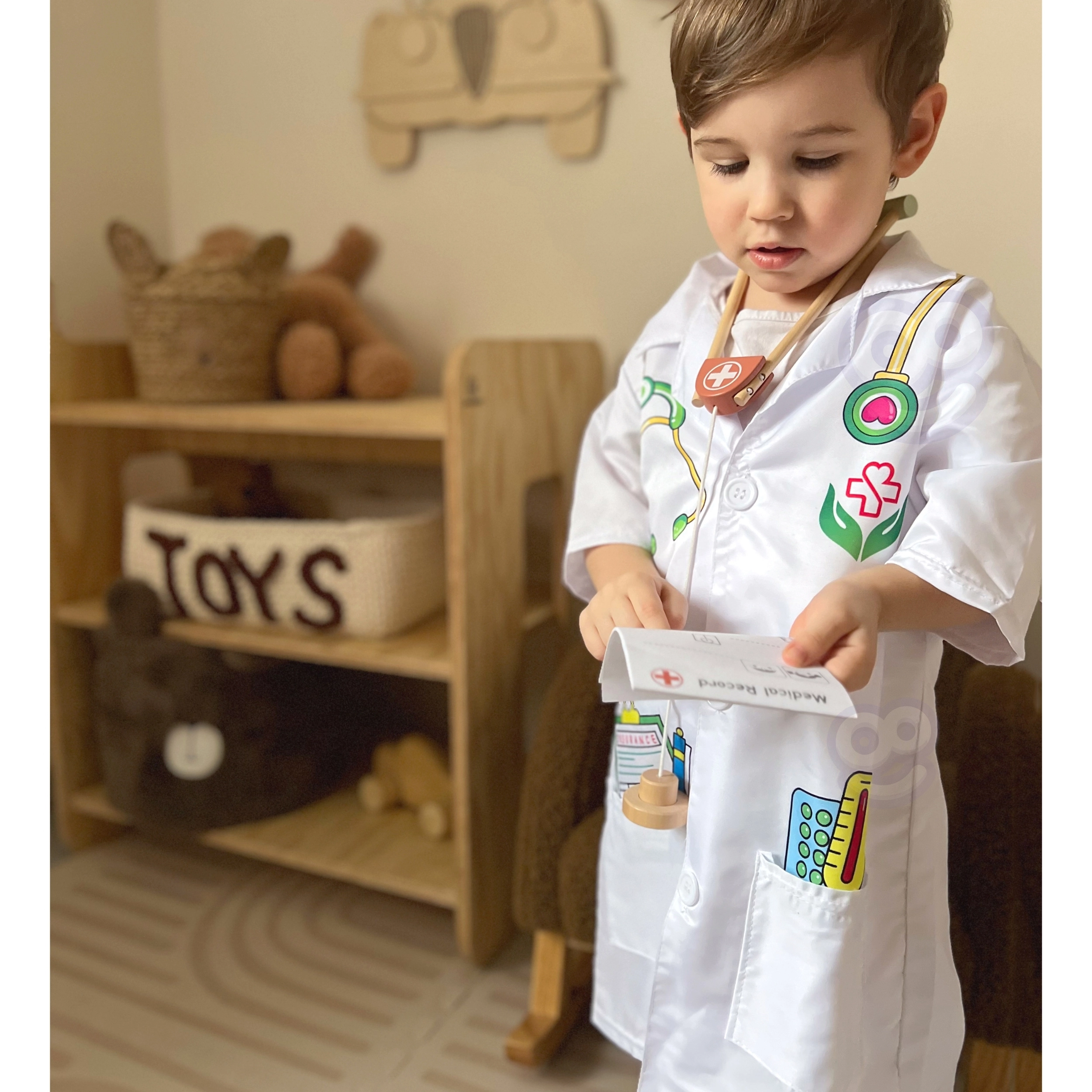 Šis precīzi izstrādātais Woopie ārsta kostīms sniedz mazajiem medicīnas cienītājiem lielisku aprīkojumu viņu iedomu spēlēm. Tas ietver krāsainas instrumentu apdrukas, piemēram, stetoskopu, zāles un termometru. Pateicoties ietilpīgām kabatām, tas ir ideāli piemērots citu rotaļu priekšmetu glabāšanai.