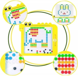 Bērni veido krāsainus attēlus un rakstus pēc šabloniem vai pēc savas fantāzijas. Magnētiskās pogas turas stingri, un darbs ar tām ir vienkāršs pat pašiem mazākajiem.