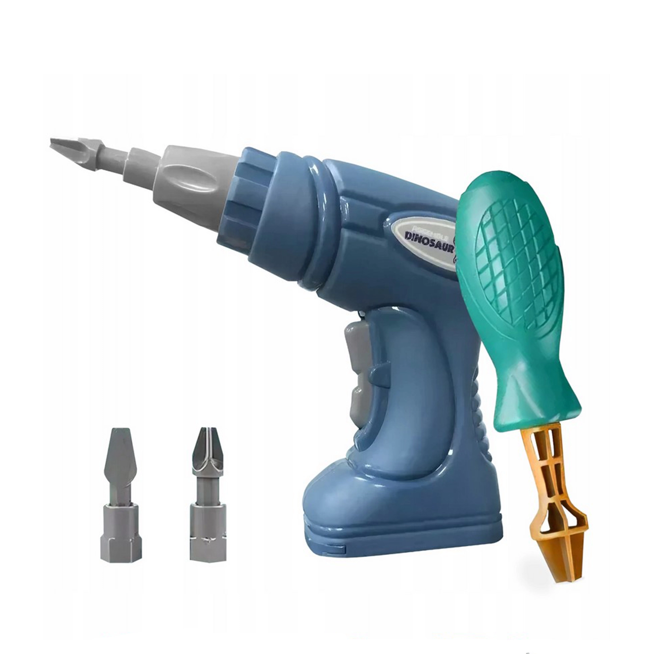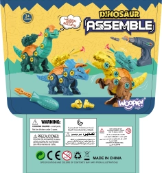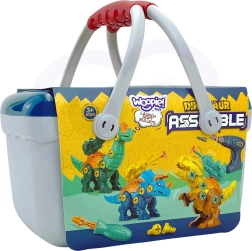 Iepakojumā ir bērnu urbis ar funkciju griešanās abos virzienos skrūvēšanai un atskrūvēšanai, maināmi uzgaļi, skrūvgriezis un izturīgas detaļas trīs dažādu dinozauru salikšanai. Visu ērti var uzglabāt praktiskā koferītī, kas ir ideāls ceļošanai un kārtīgai uzglabāšanai.