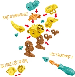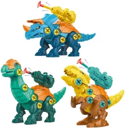 - 3 dinozauri salikšanai – krāsainas detaļas, skrūves un kustīgi savienojumi.