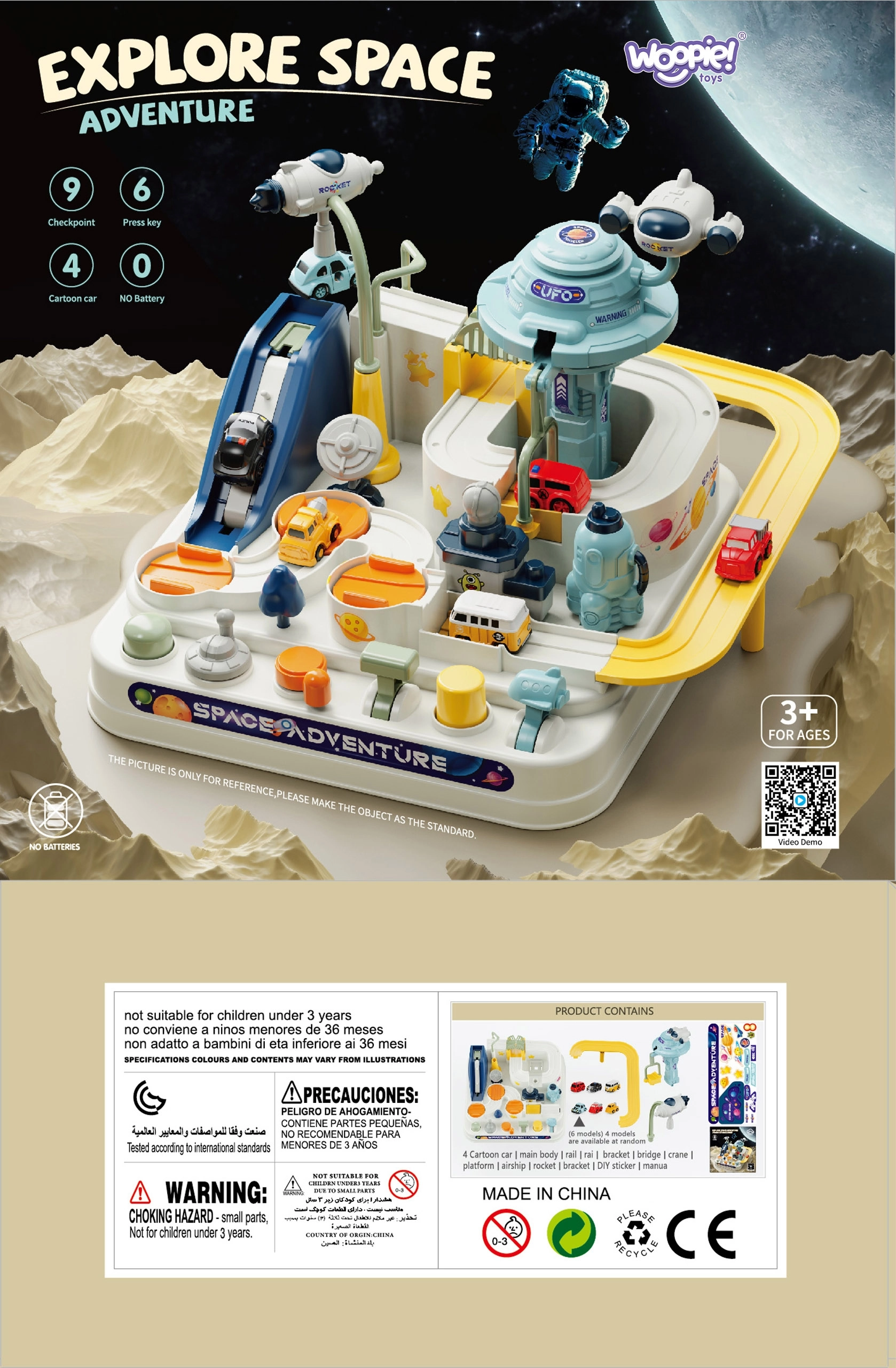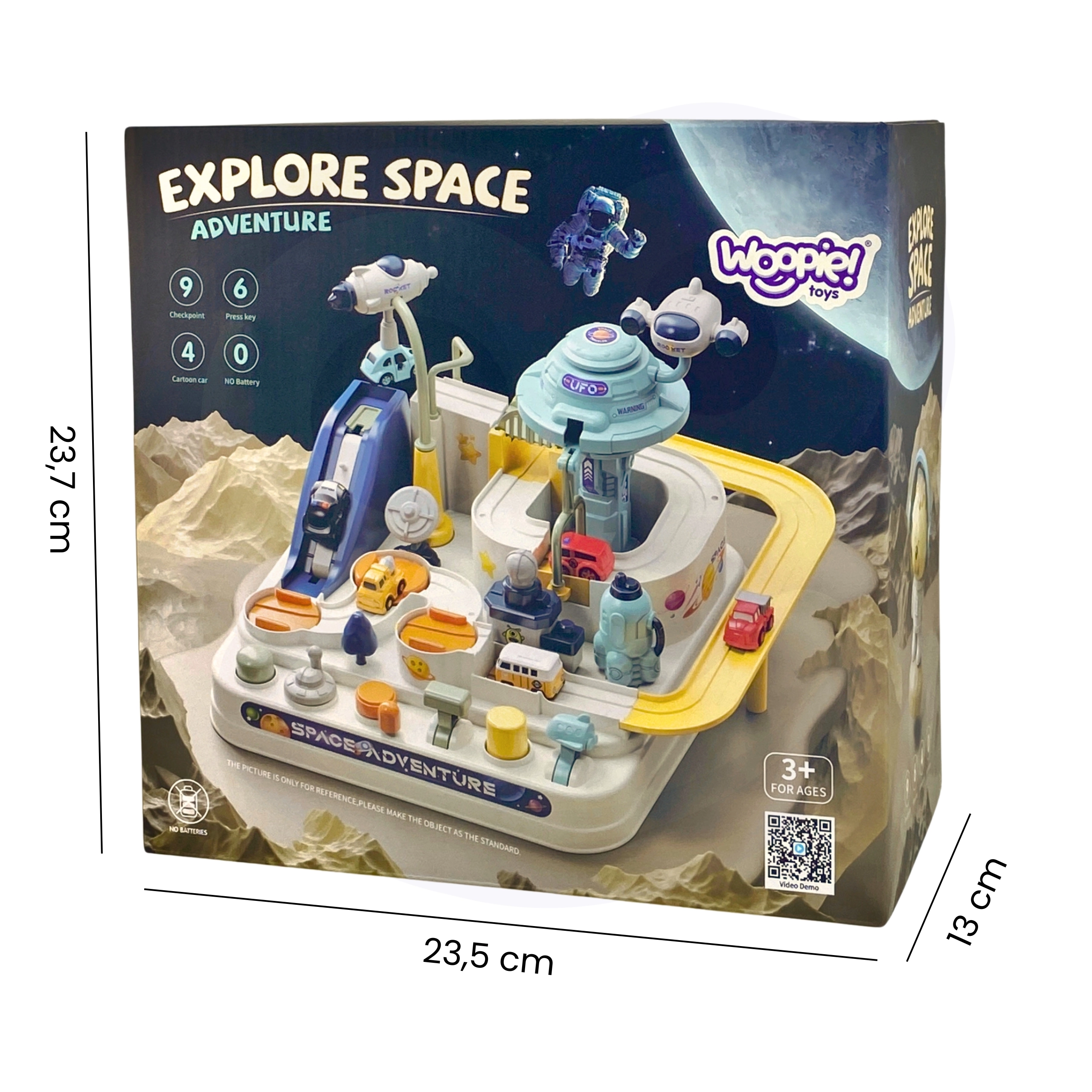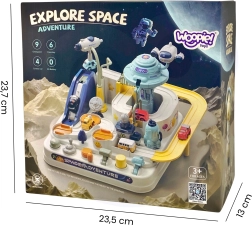 Atklājiet bezgalīgo iztēles kosmosu ar Woopie interaktīvo autiņmašīnu trasi. Bērni vada transportlīdzekļu kustību ar mehāniskām svirām, pogām un slēdžiem – bez baterijām. Izklaidējošā kosmosa bāze ar palaišanas ierīci, kustīgām platformām un liftu attīsta sīko motoriku, loģisko domāšanu un roku–acu koordināciju.