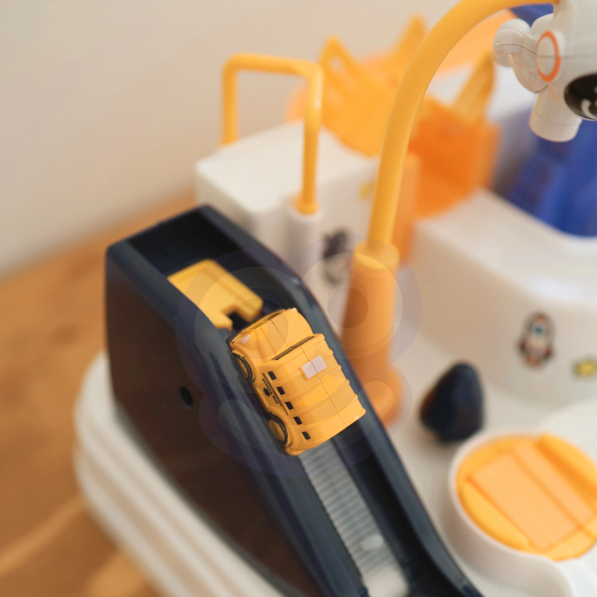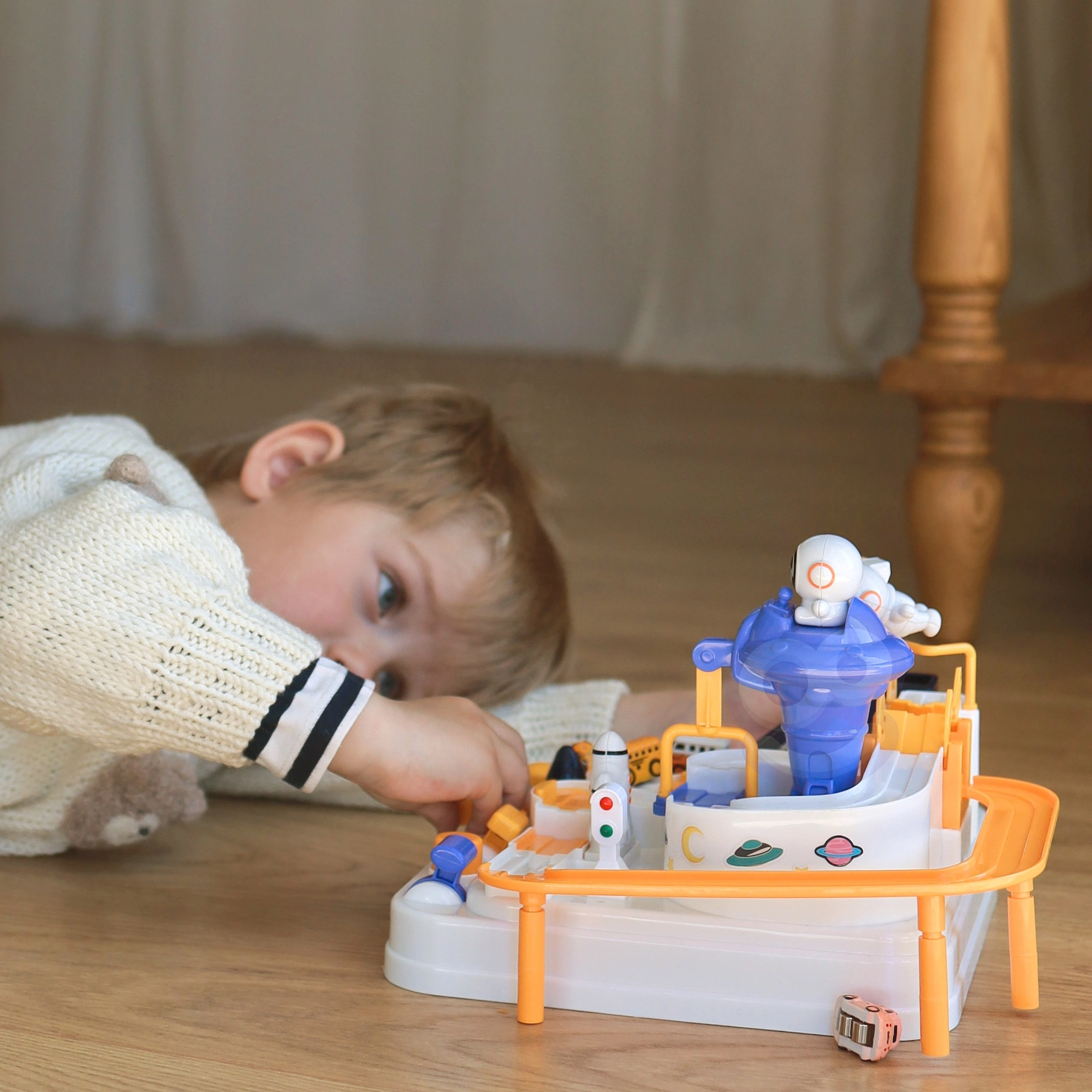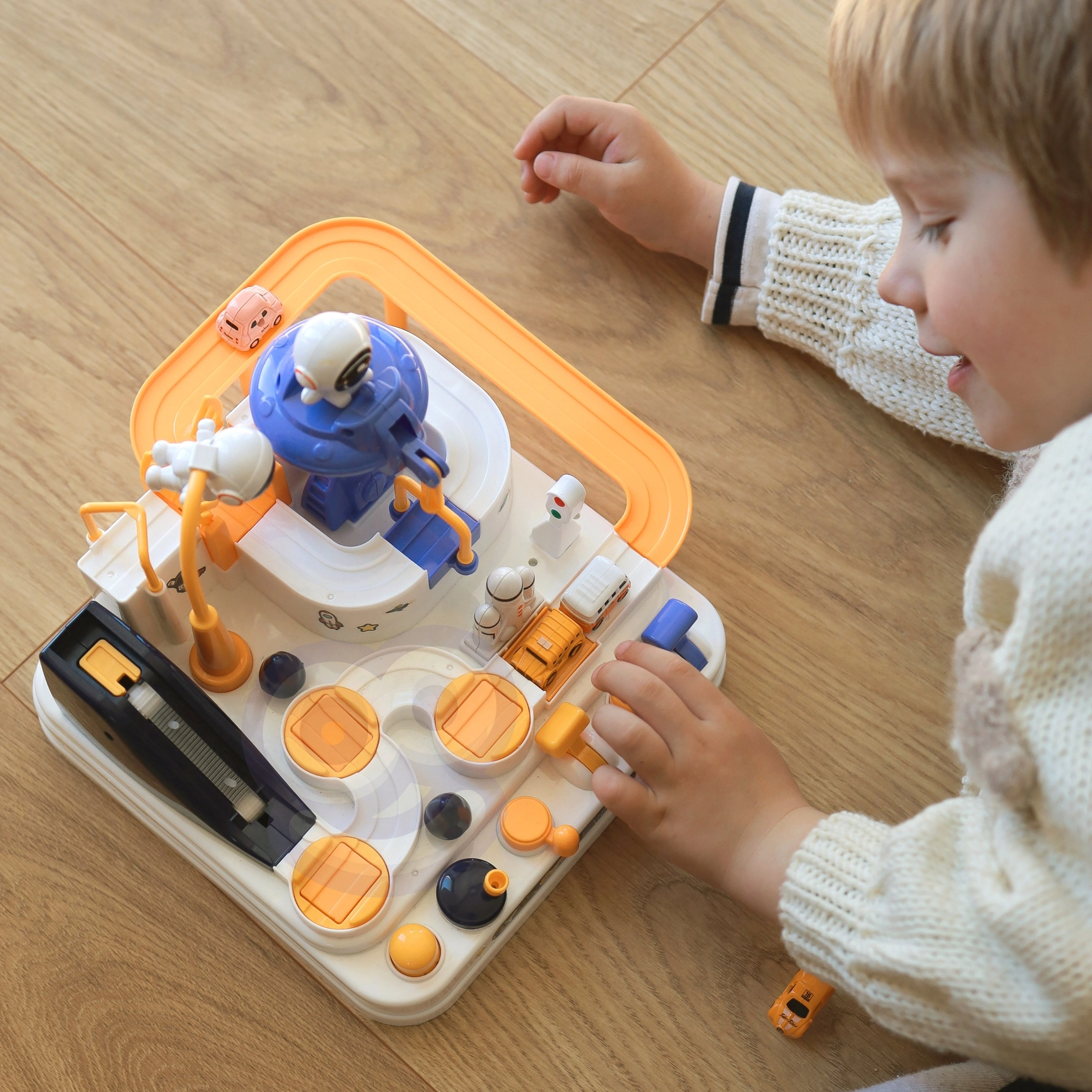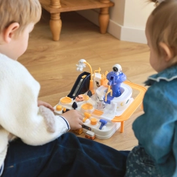 Kosmosa stacija pārvēršas par dinamisku spēļu laukumu: bērni plāno maršrutu, pārvar šķēršļus un ar pogām un vadības elementiem virza mašīnītes pa rampām, liftiem un rotējošām platformām. Magnētiskā raķete “pa gaisu” pārceļ transportlīdzekļus uz paceļamo tiltu, kuru var pacelt un nolaist pēc vajadzības.