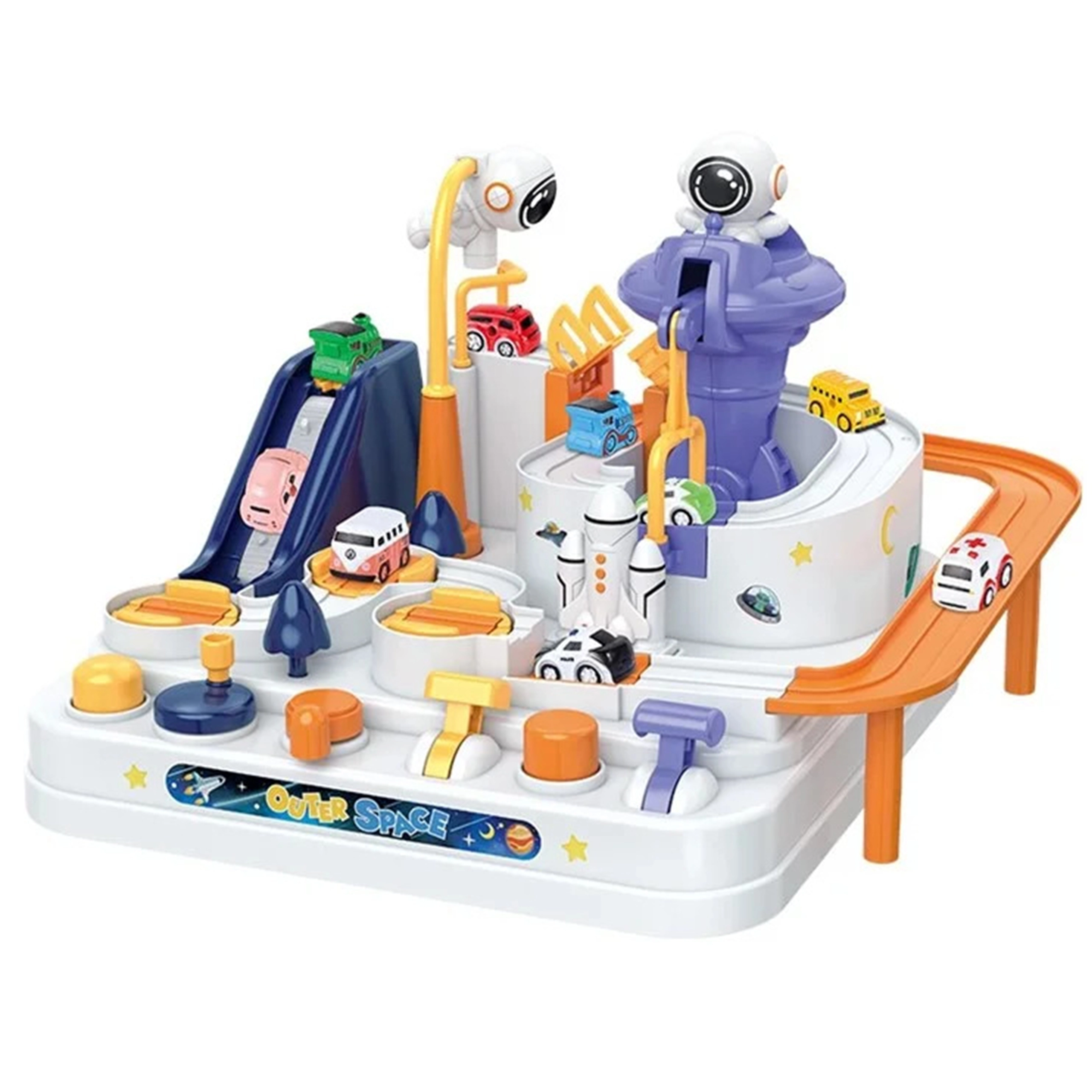 Iepakojumā ir trīs mašīnītes (motīvs piešķirts nejauši), ar kurām bērni var baudīt solo braucienus, stafetes un ātruma sacīkstes pa dažādiem kosmosa stacijas maršrutiem.
