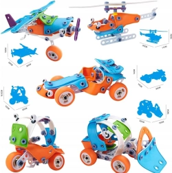 Šajā komplektā ir 118 detaļas, kas ļauj izveidot dažādus transportlīdzekļus, piemēram, buldozeru, helikopteru, lidmašīnu vai kartingu. Tas palīdz attīstīt radošumu un manuālās iemaņas, ļaujot bērniem iepazīt būvniecības un dizaina pasauli ar lielu gandarījumu un prieku.