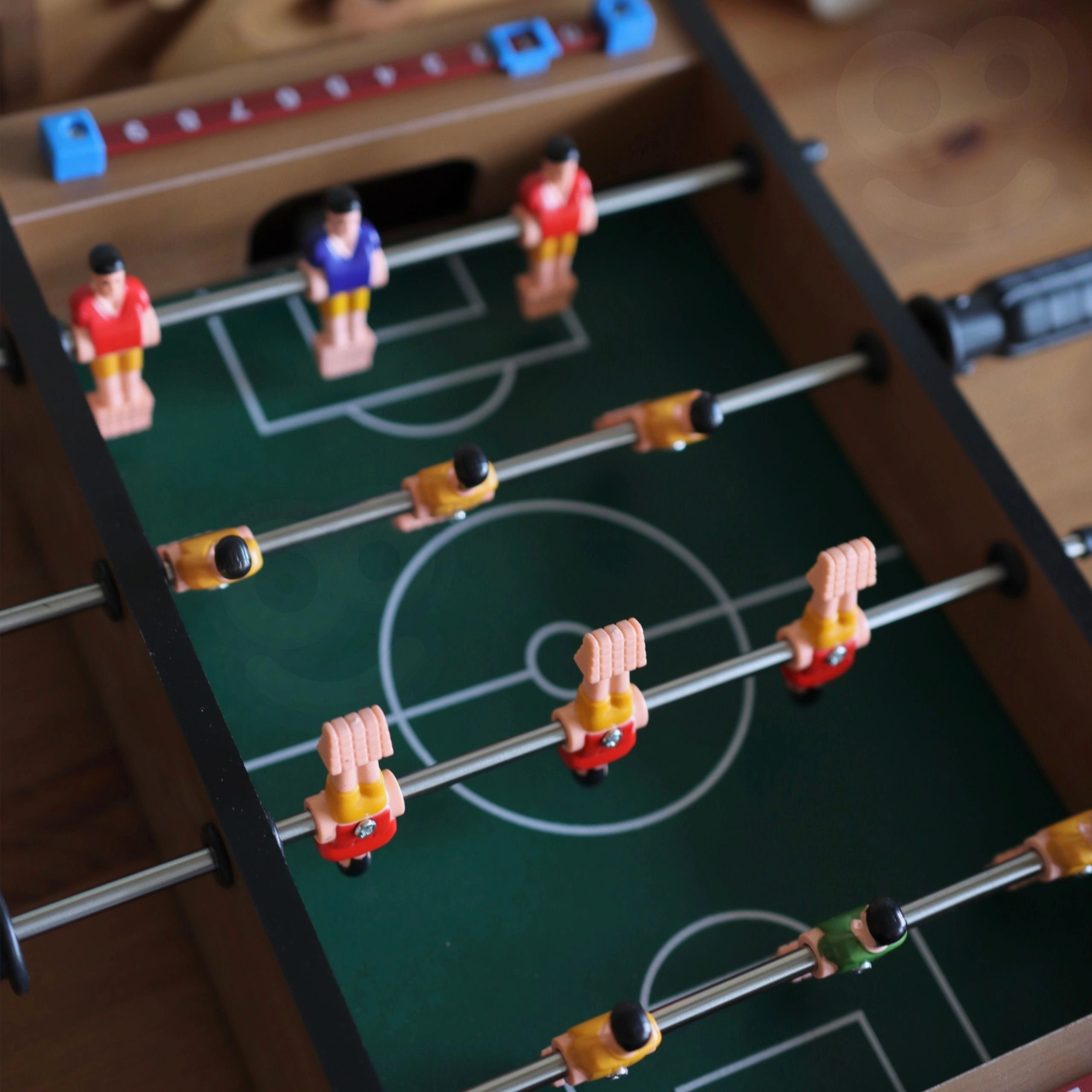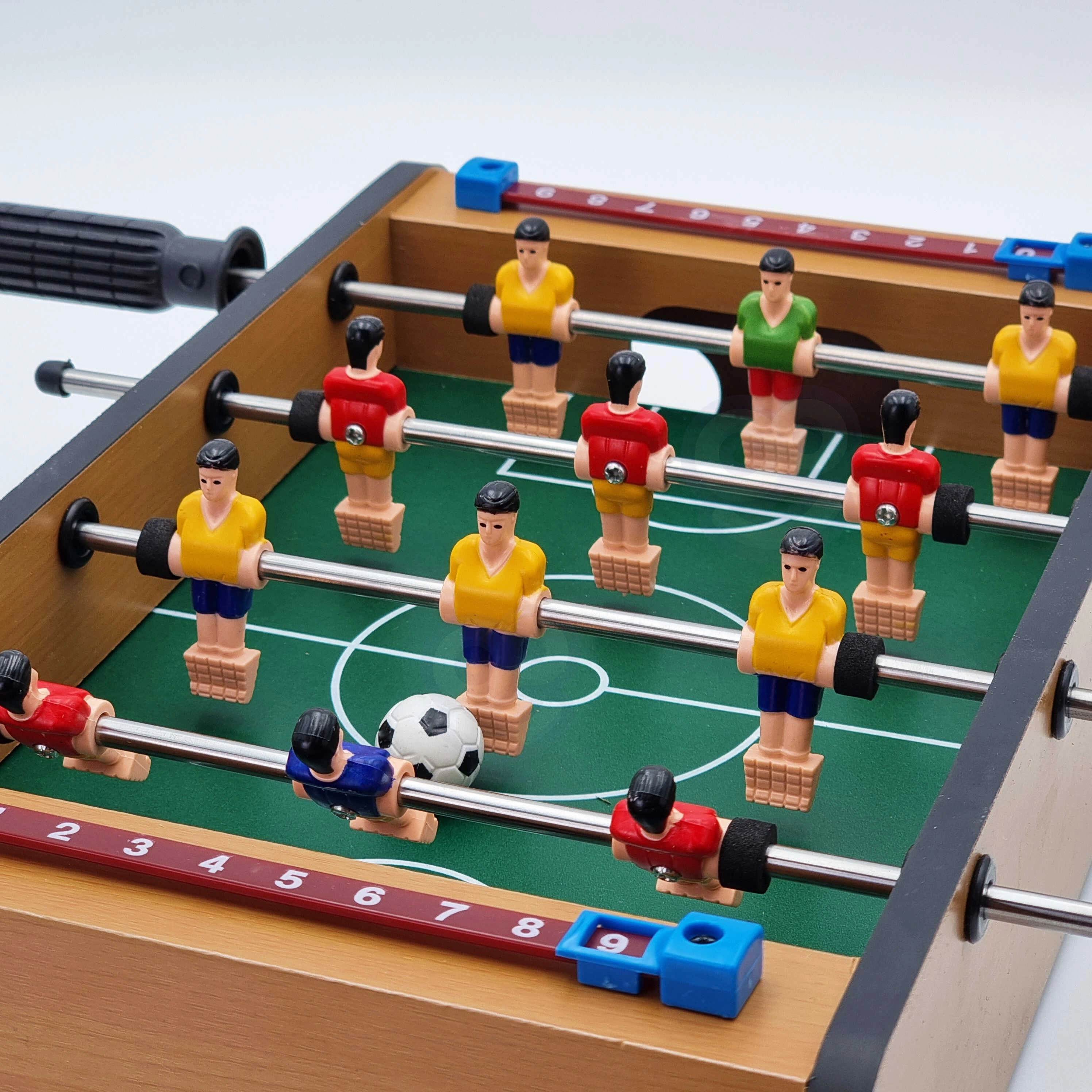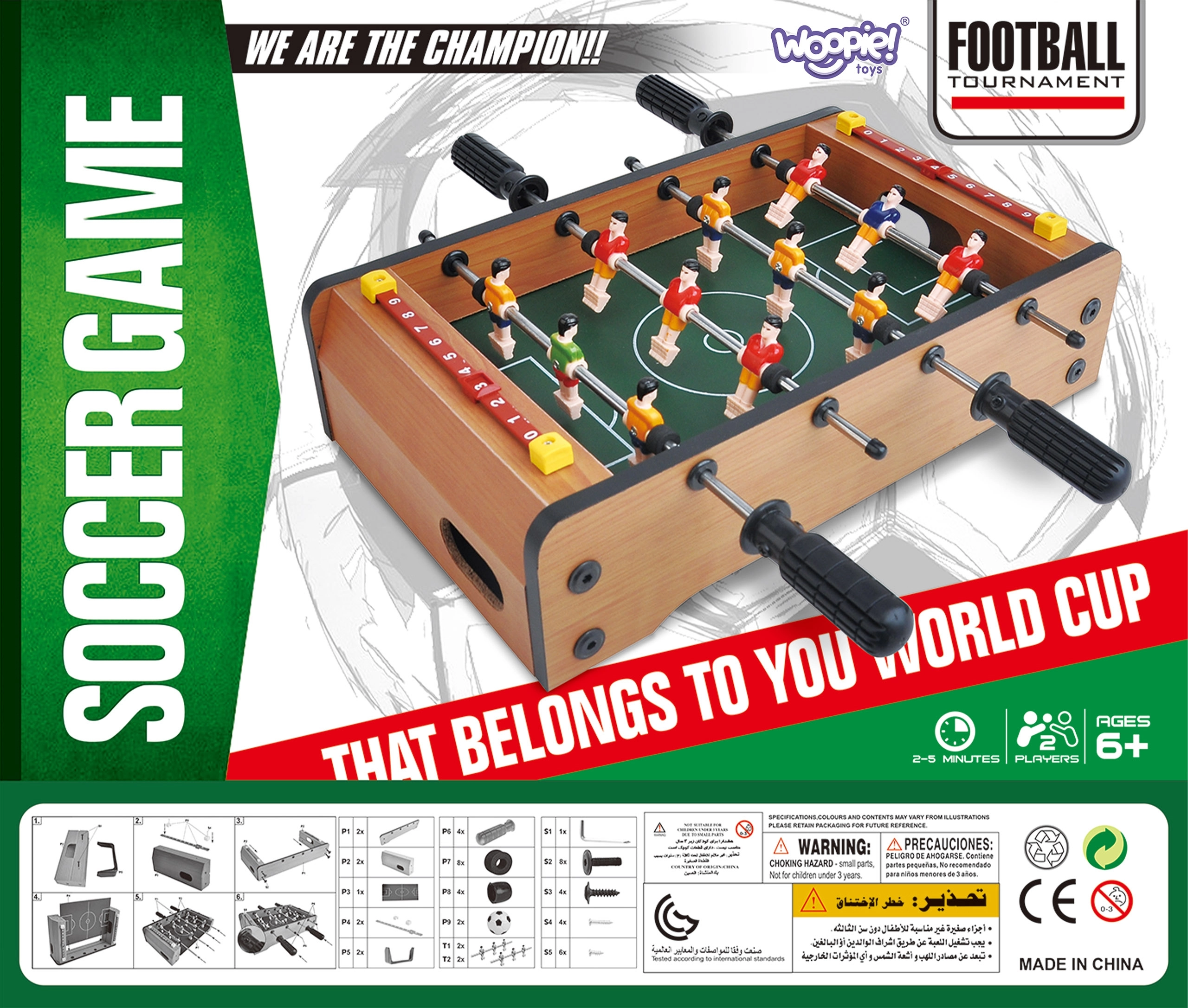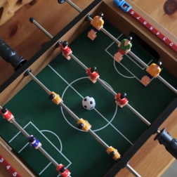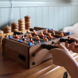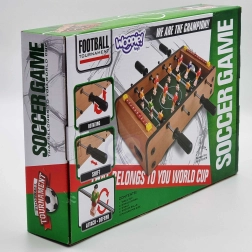 Izbaudiet aizraujošas mini spēles ar kompakto WOOPIE galda futbolu. Stabilā koka konstrukcija, metāla stieņi un ergonomiski rokturi nodrošina plūdenu figūriņu vadību un ērtu spēli. Integrētie rezultāta skaitītāji abās pusēs palīdzēs sekot spēles gaitai.