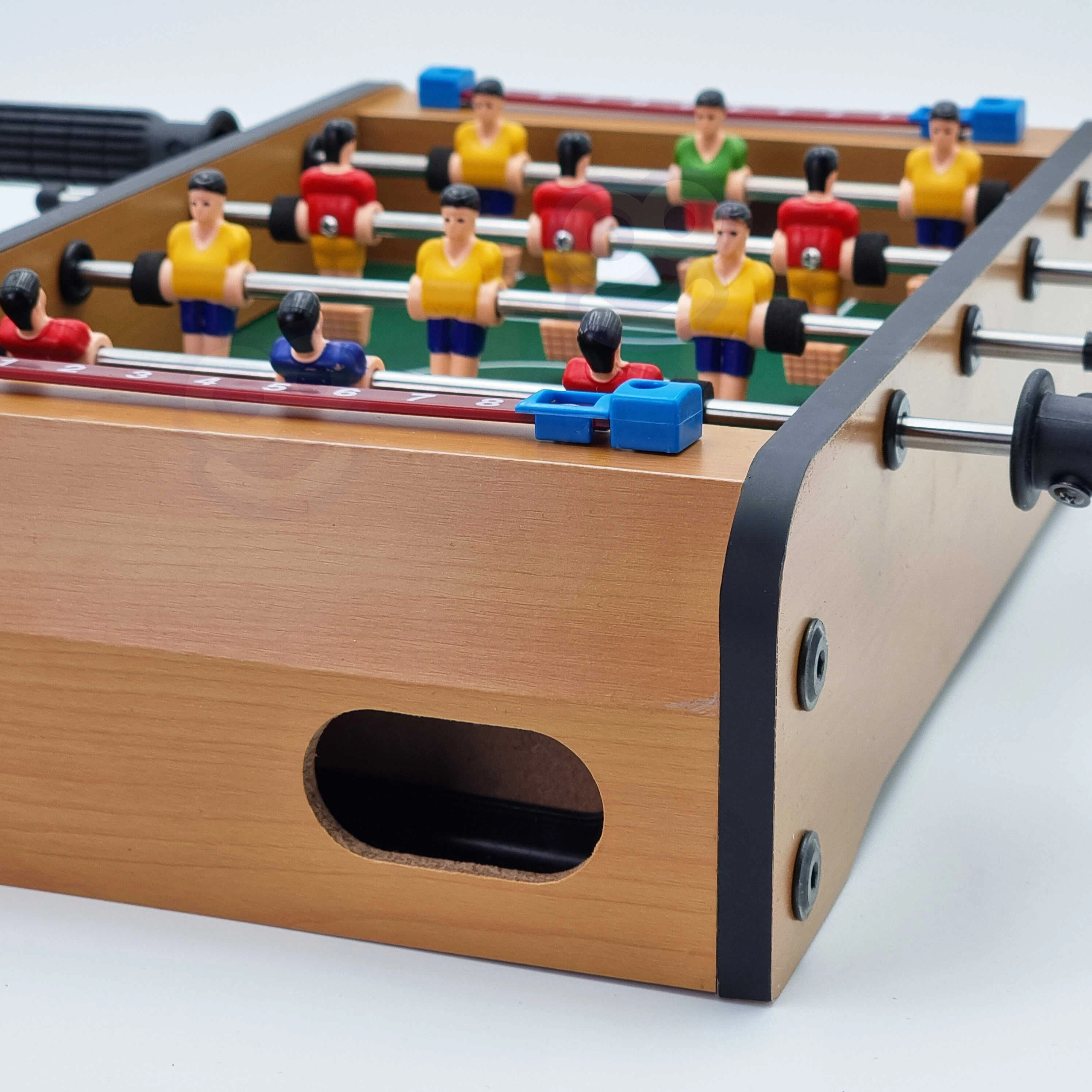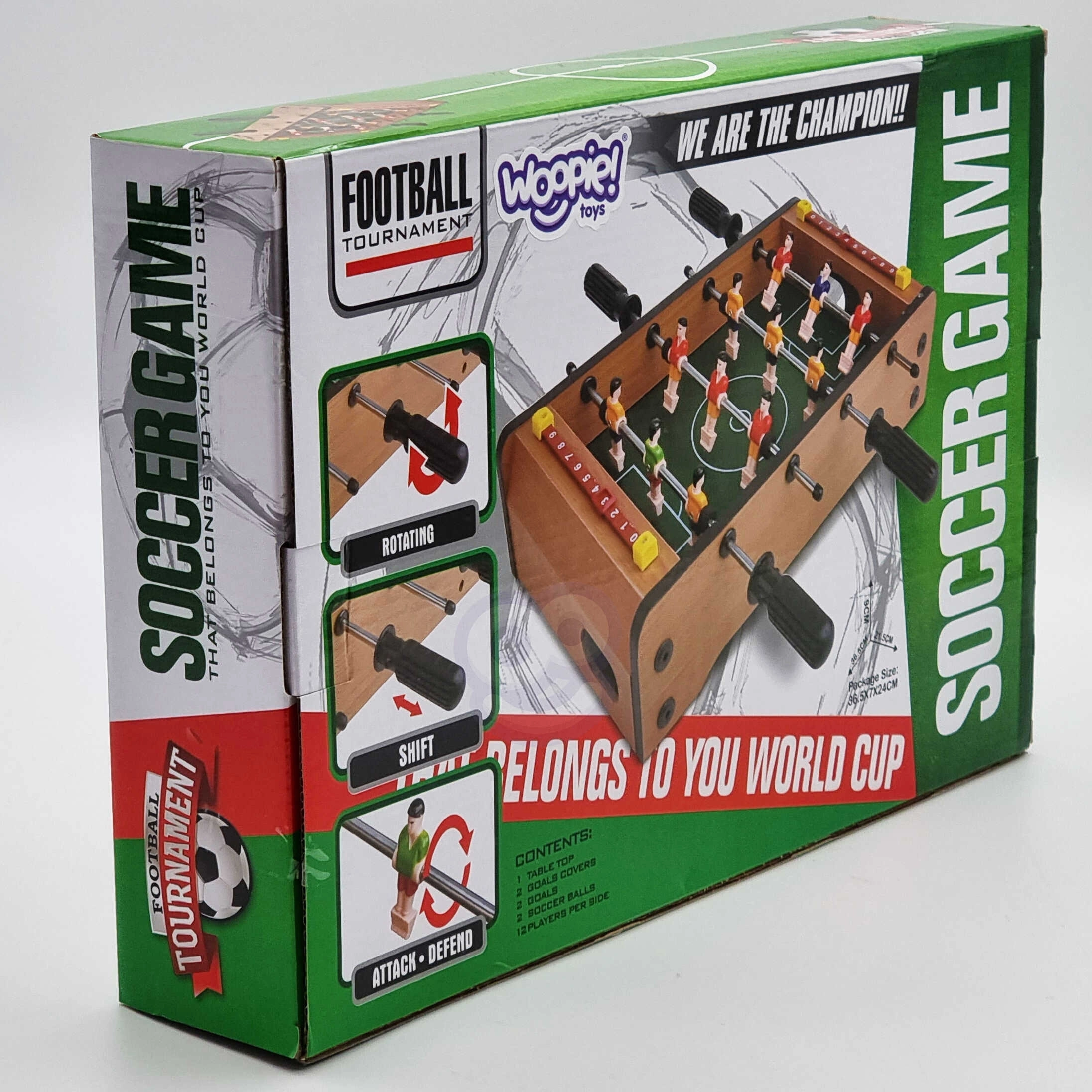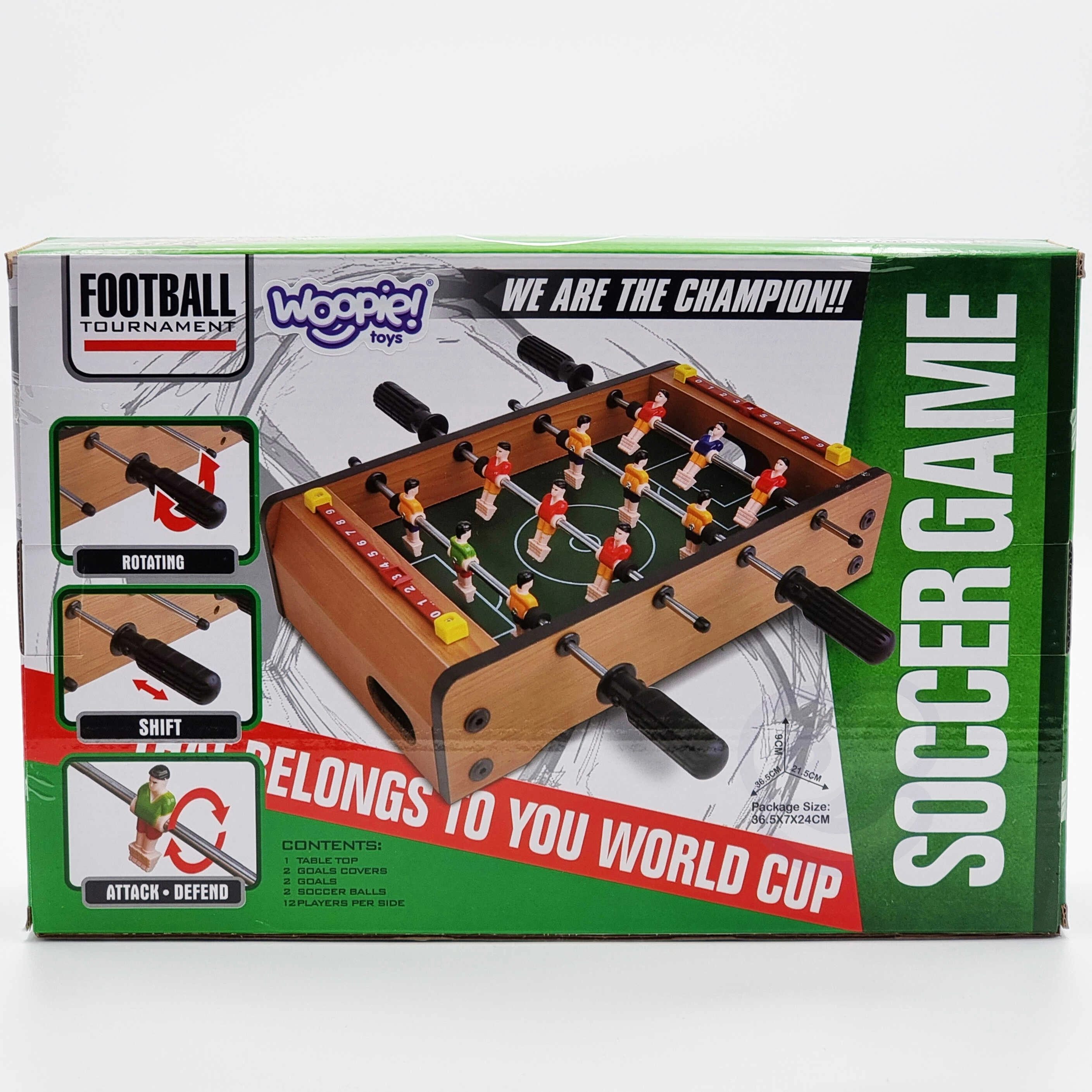 Kompaktais galda futbols WOOPIE piedāvā lielu izklaidi nelielā izmērā. Ideāli piemērots mājām, bērnu istabām un nedēļas nogales spēlētājiem. Nodrošina spēli diviem, 12 spēlētājus uz četrām stieņiem, rezultāta skaitītājus un izturīgus materiālus. Pateicoties nelielajiem izmēriem un vieglajam svaram, tas ir viegli pārnēsājams un lieliski piemērots ātrām spēlēm jebkurā diennakts laikā.