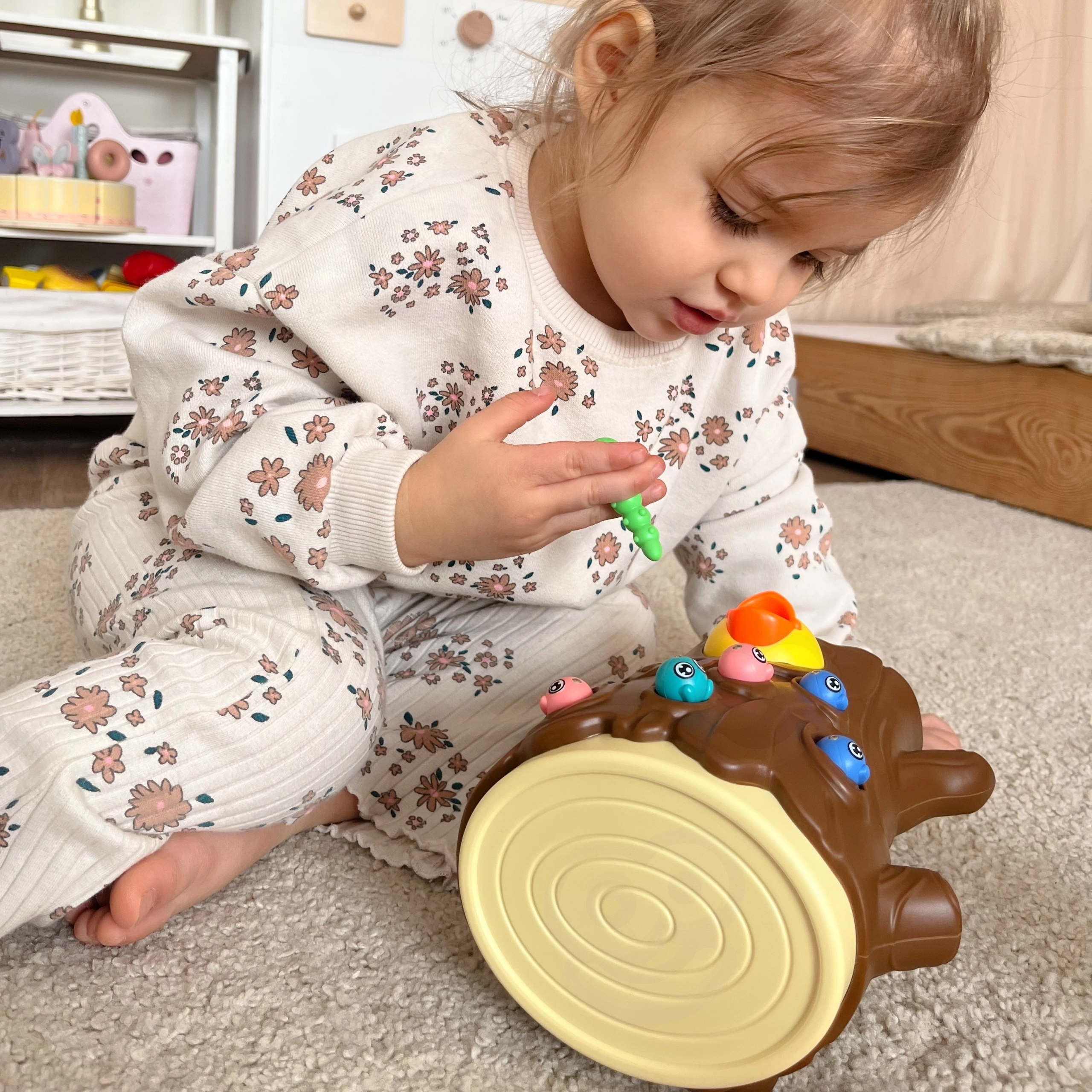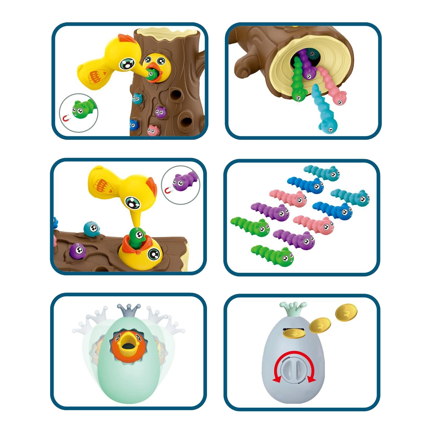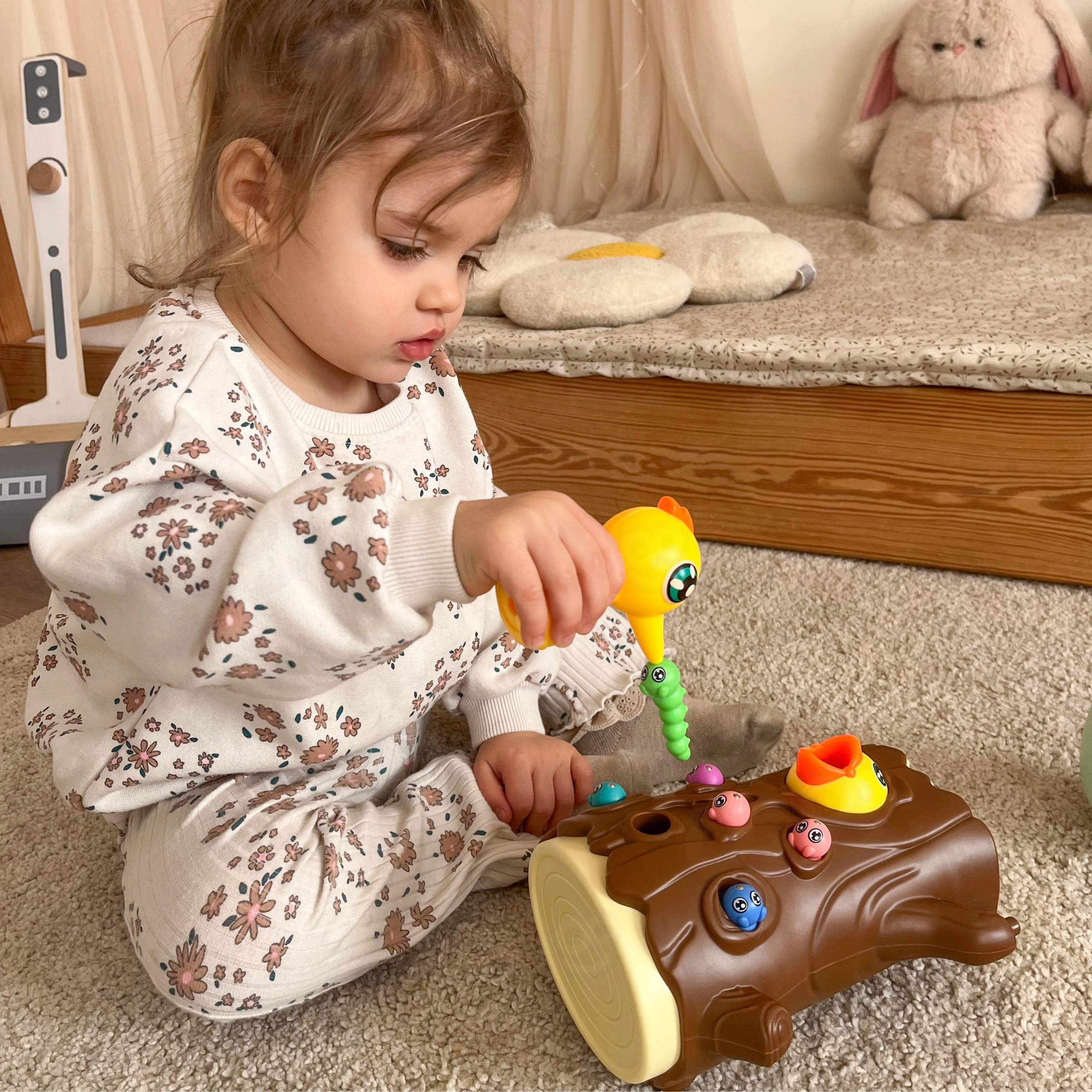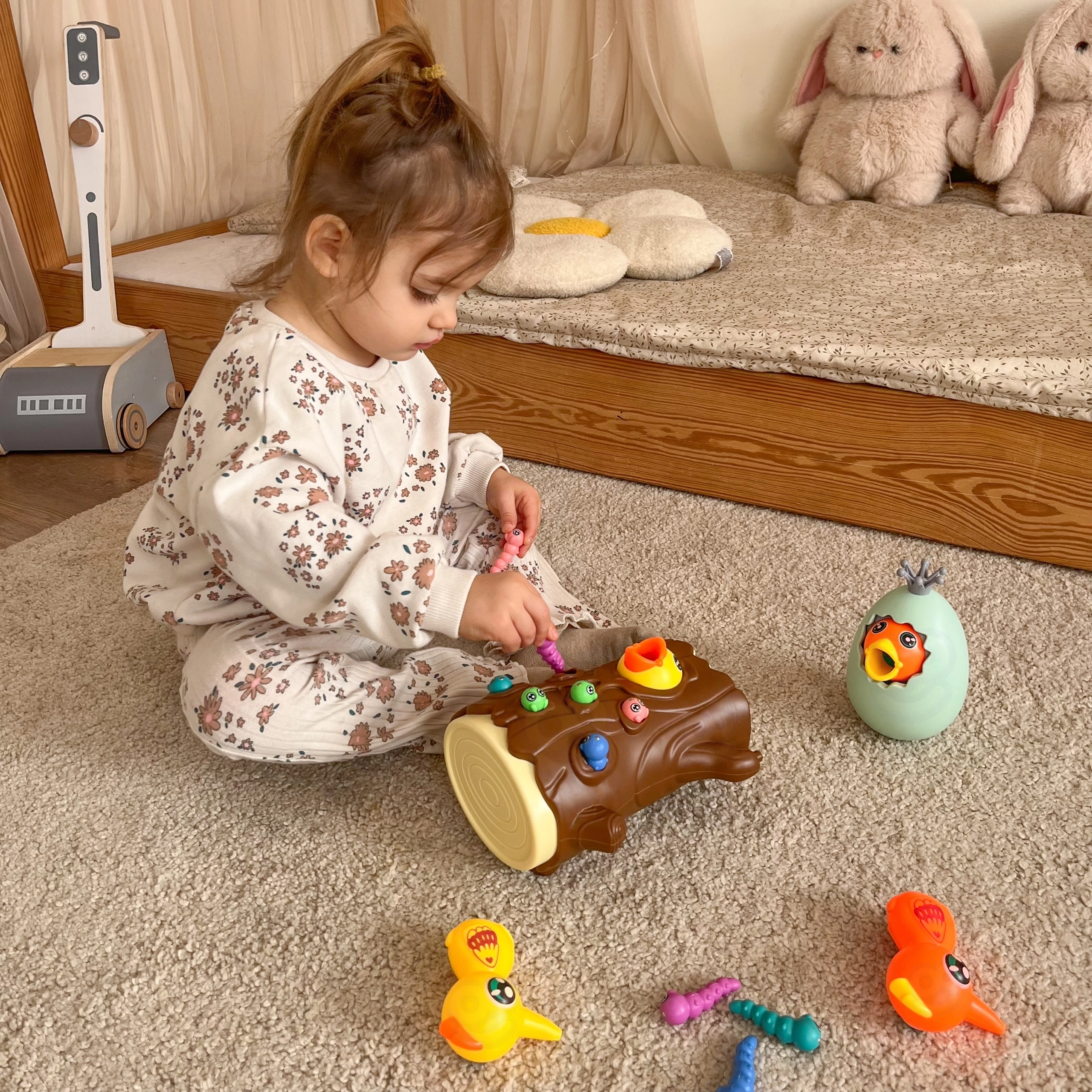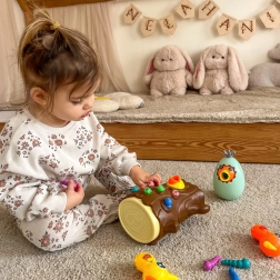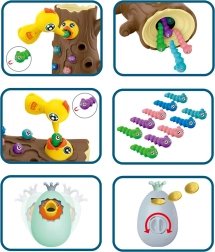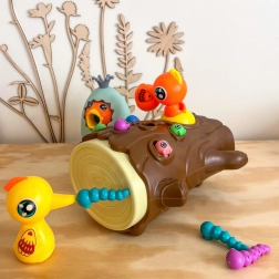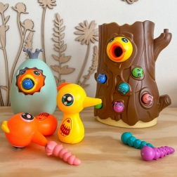 Ar magnētiskiem knābīšiem bērni ķer tārpiņus un baro putnēnu. Tiek trenēta precizitāte, satvēriens un acu–roku koordinācija jautrā veidā.
