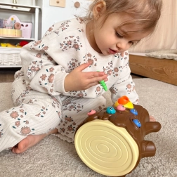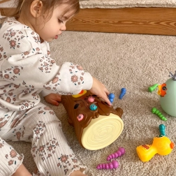 Magnētiskā spēle Noķer tārpiņu piedāvā bērniem no 3 gadu vecuma rotaļīgu veidu prasmju trenēšanai. Uzdevums ir atrast krāsainos tārpiņus celmā un ar magnētiskiem koka “dzeņiem” tos pārnest pie izsalkušā putnēna. Vienkāršie noteikumi iesaista arī vecākus un brāļus/māsas, lai kopā kvalitatīvi pavadītu laiku.