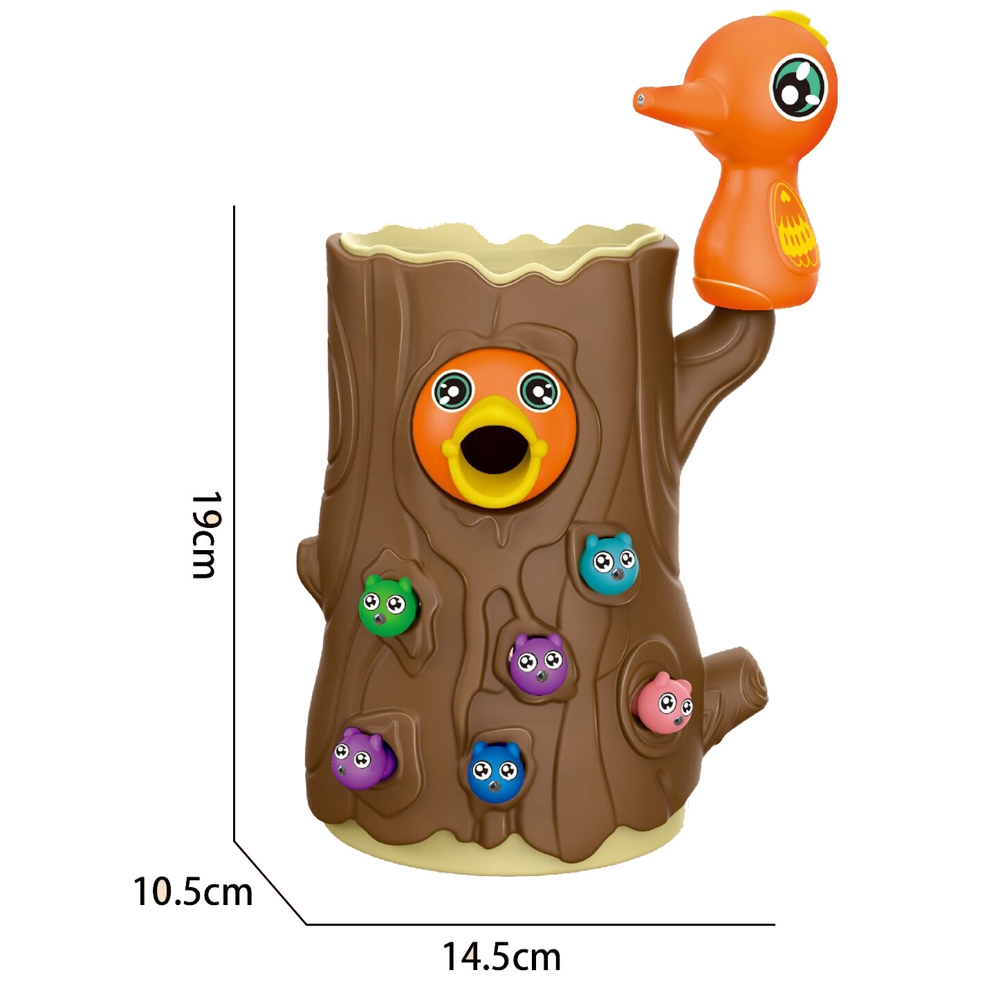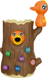 - 2 magnētiski “dzeņi”, putnēna oliņa (krājkasīte/lellīte, kas pieceļas), putnēns celmā, 10 krāsaini tārpiņi