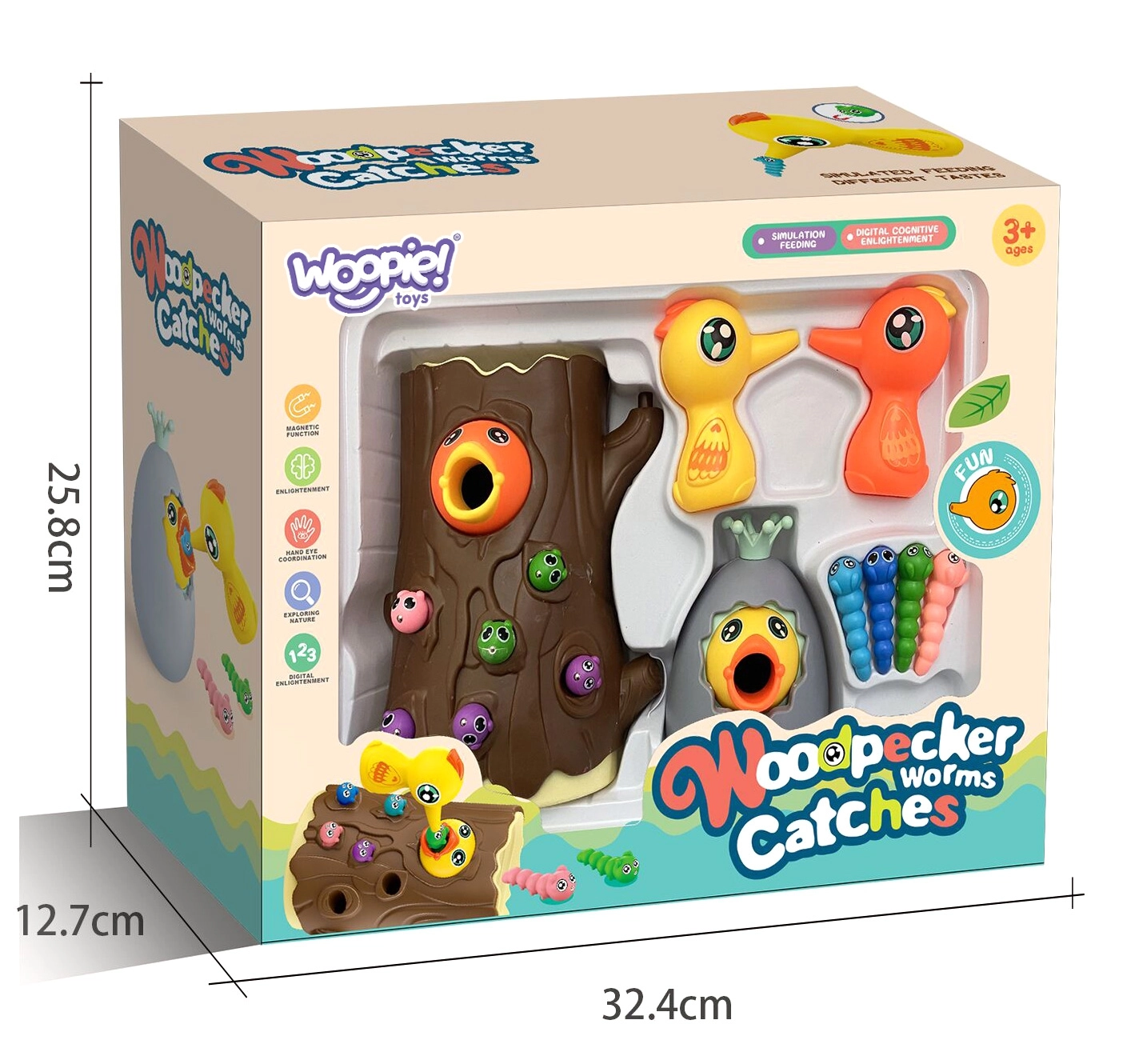 Aizraujoša magnētiskā spēle 3in1 no zīmola WOOPIE apvieno mācīšanos caur spēli un ģimenes izklaidi. Bērni ar magnētisku knābīšu palīdzību “noķer” tārpiņus un baro putnēnu celmā, attīstot smalko motoriku, acu–roku koordināciju un koncentrēšanos. Oliņu var izmantot kā krājkasīti un kā lellīti, kas pieceļas, spēle ir ideāli piemērota diviem spēlētājiem un lieliski veicina pacietību un precizitāti.
