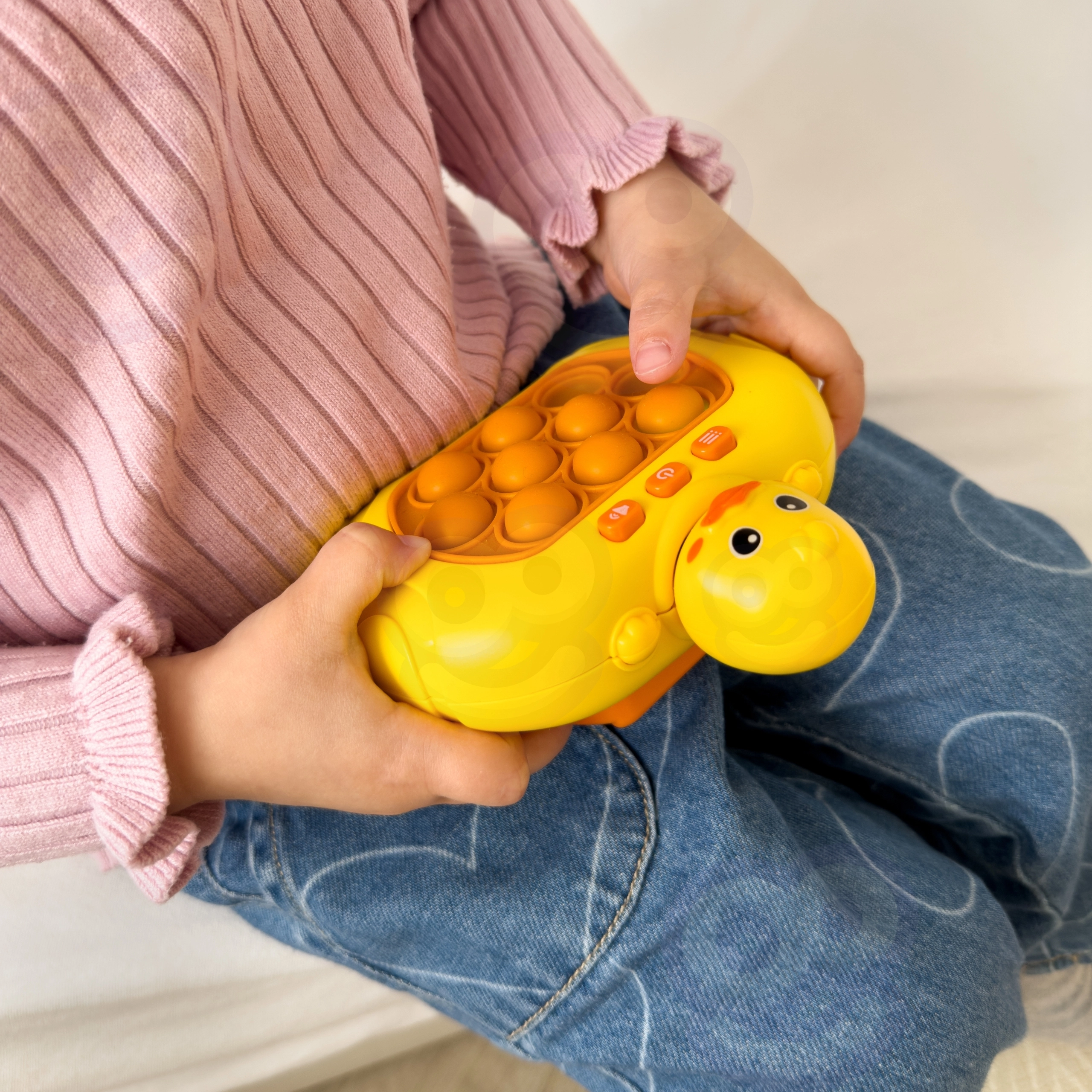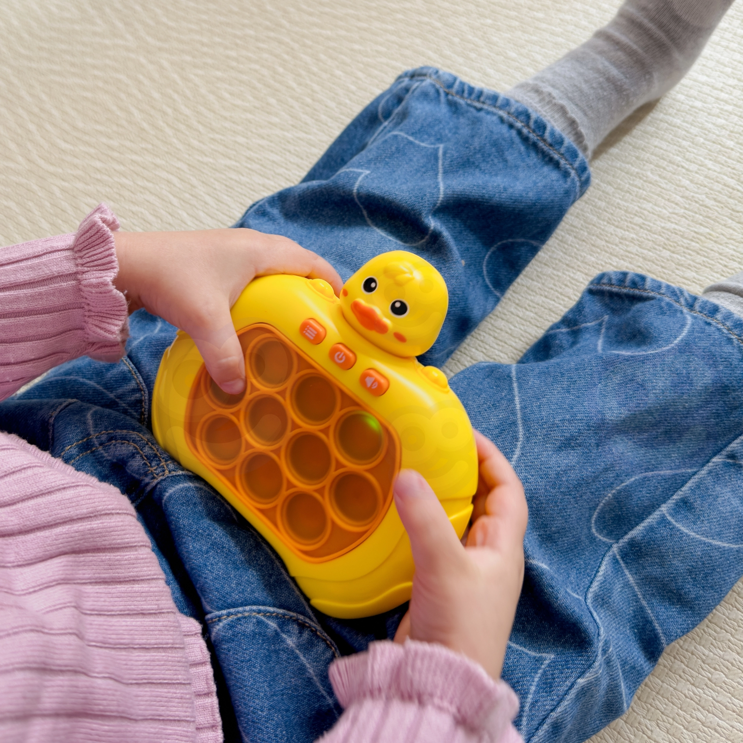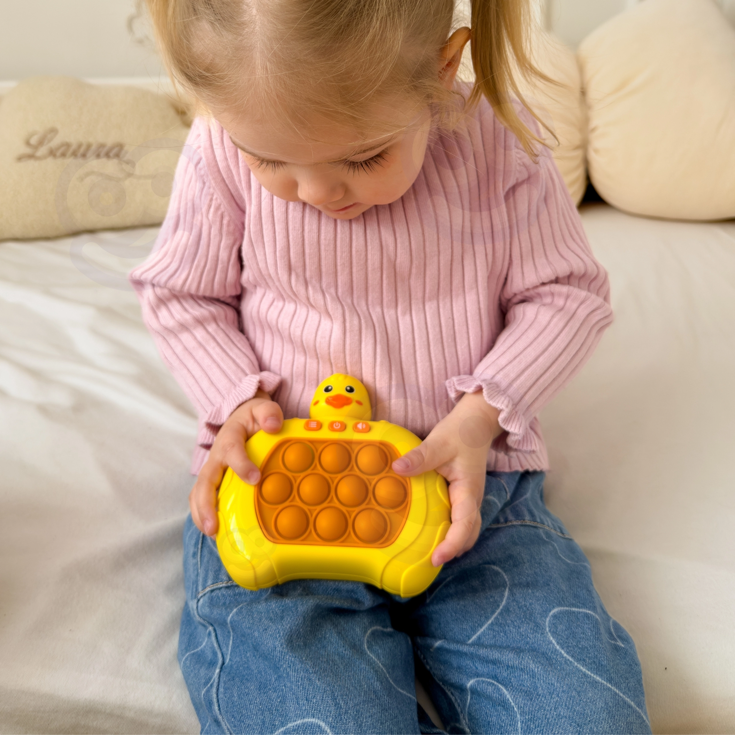 Šarmantā pīlīte ar pop-it burbulīšiem piedāvā vairāk nekā tikai spaidīšanu – pateicoties iebūvētajām pogām un skaņām, tā sniedz 4 aizraujošus spēļu režīmus, kas mudina bērnus kustināt pirkstus, trenē atmiņu un uzlabo reakciju. Atpūta un mācīšanās vienā kompaktā komplektā.