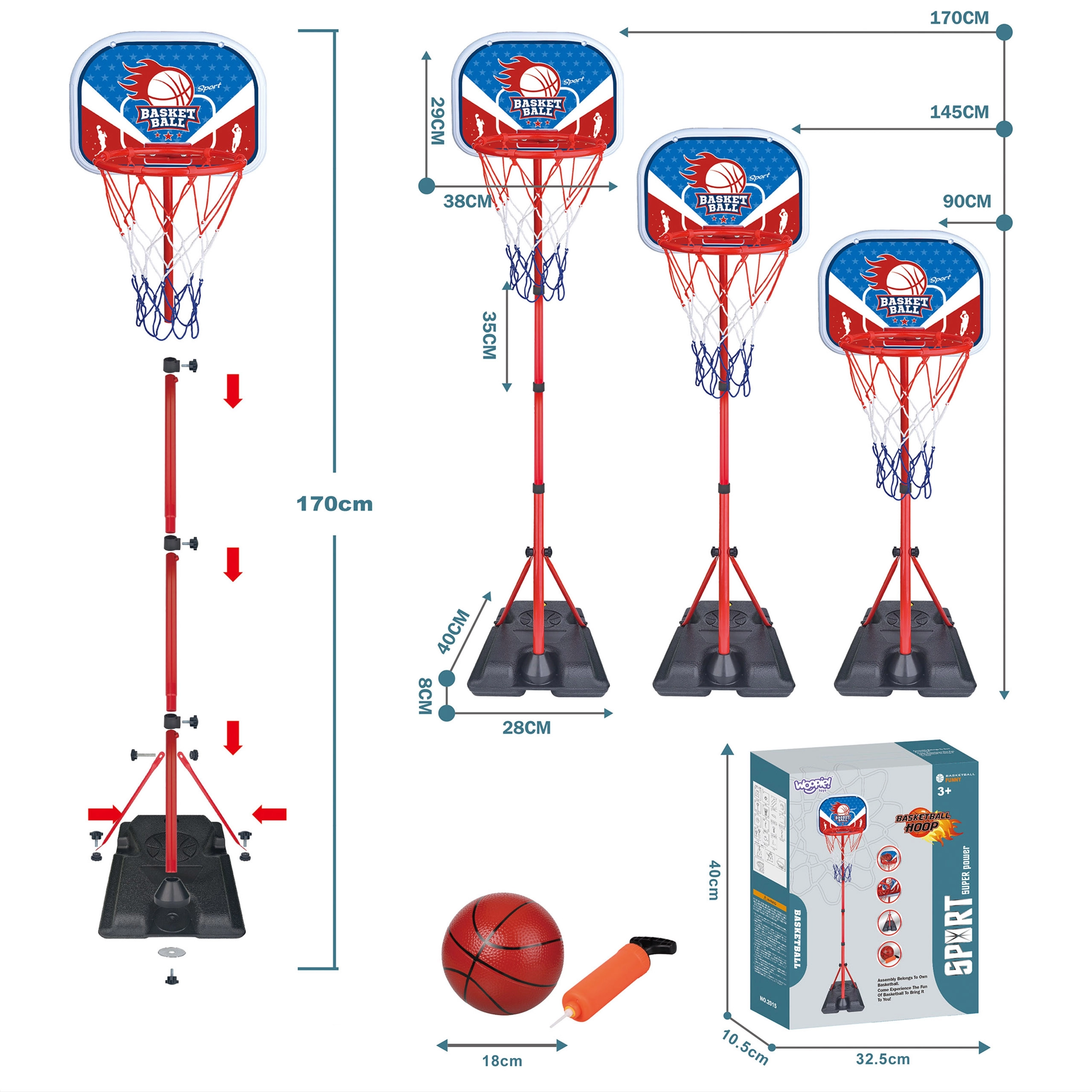 Komplektā iekļauta basketbola bumba un pumpis, lai jūs varētu sākt mest grozā tūlīt pēc salikšanas.