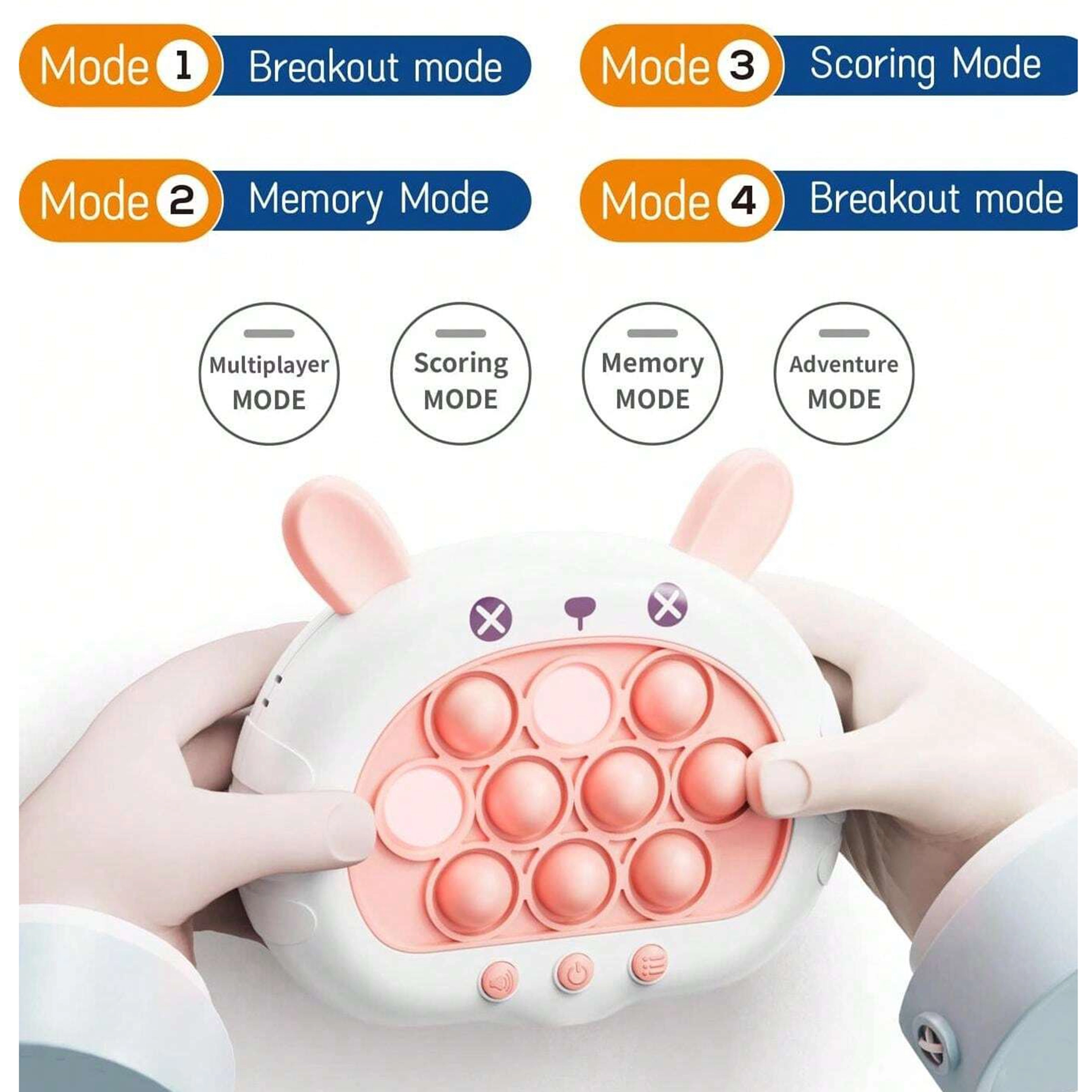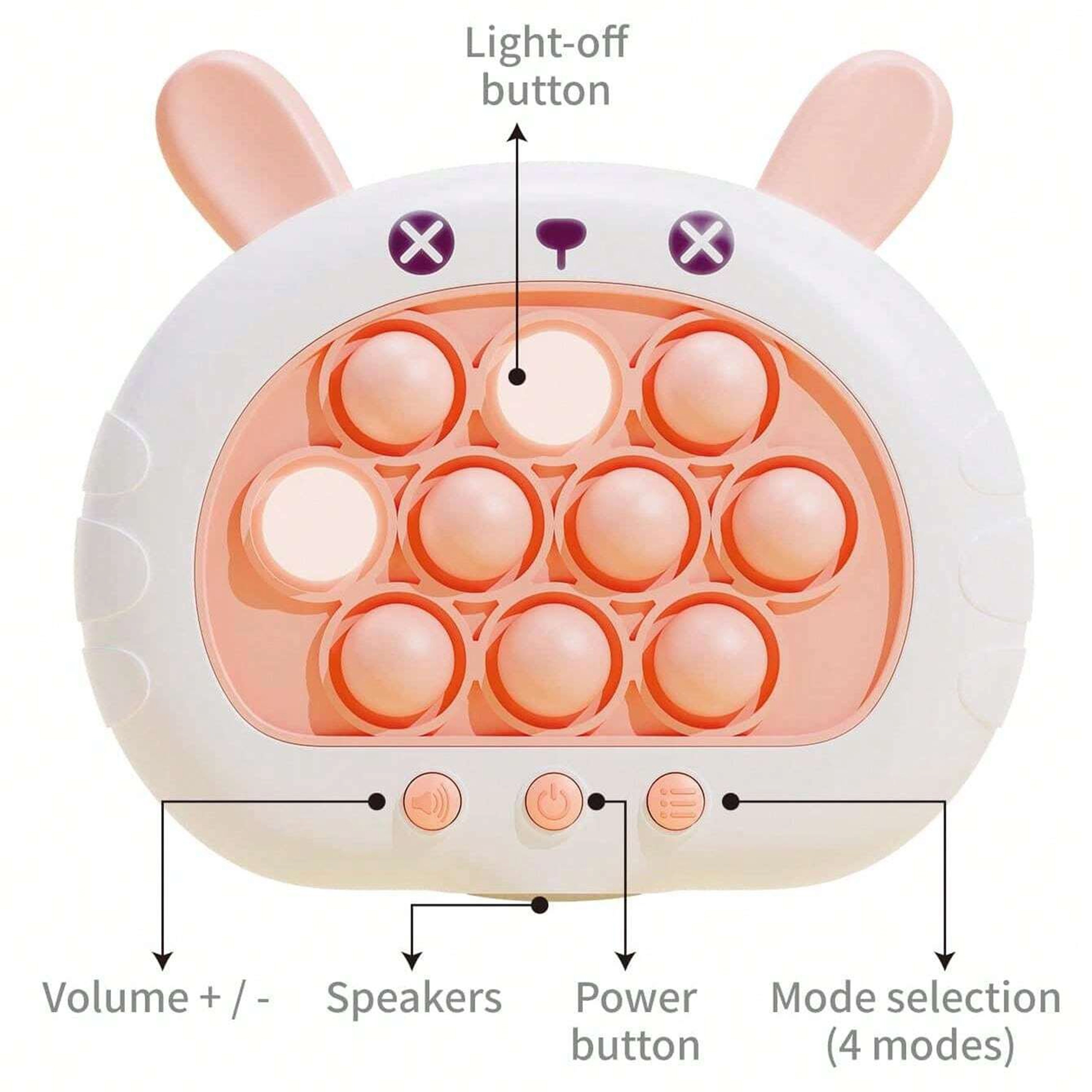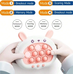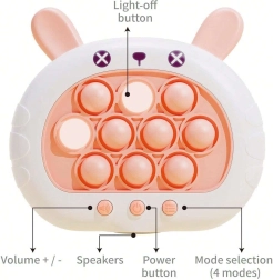 Aizraujošā un interaktīvā spēle POP IT Zaķītis sniedz prieku gan bērniem, gan pieaugušajiem. Tā attīsta domāšanu, roku prasmes, acu-roku koordināciju un palīdz cīnīties ar stresu. Šī rotaļlieta piedāvā četrus dažādus spēles režīmus, kas ikvienu noturēs saspringtā uzmanībā.