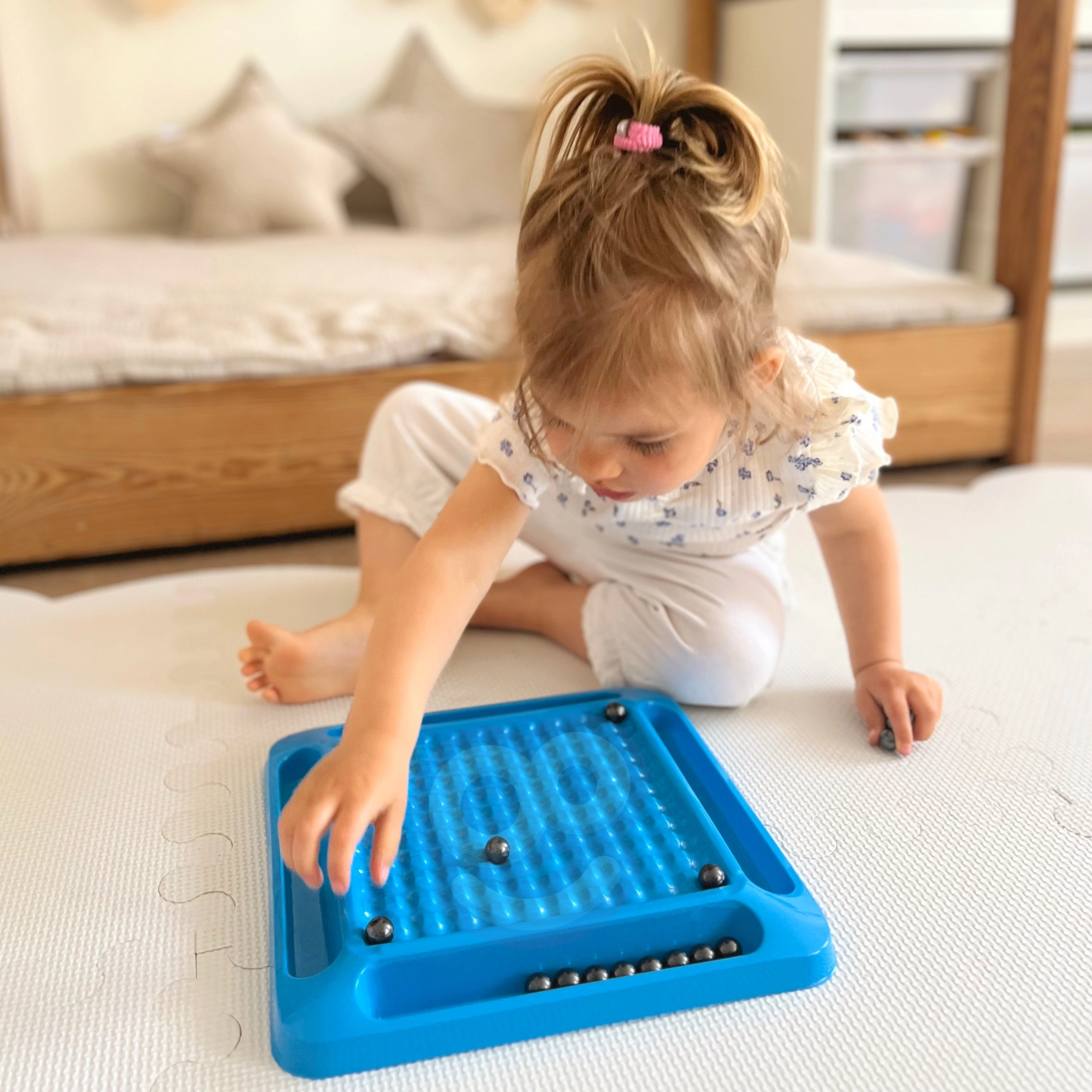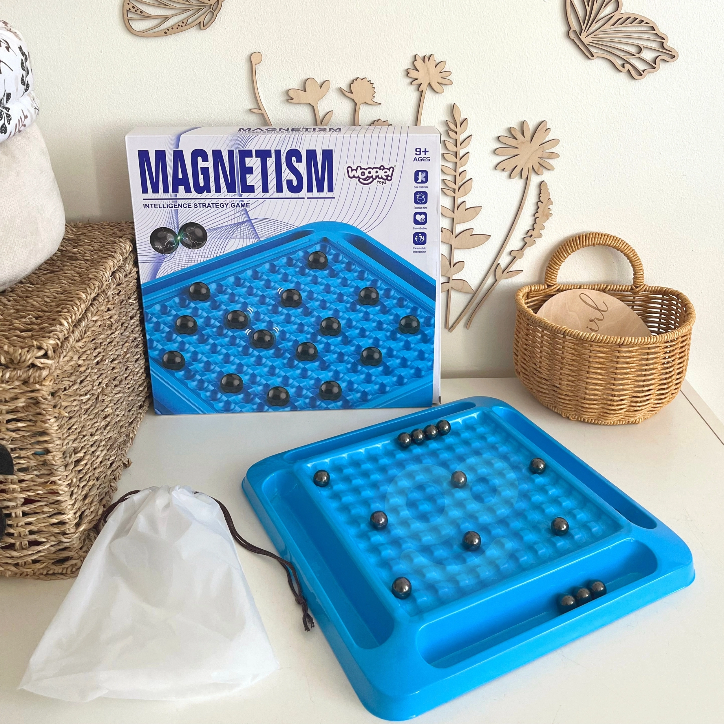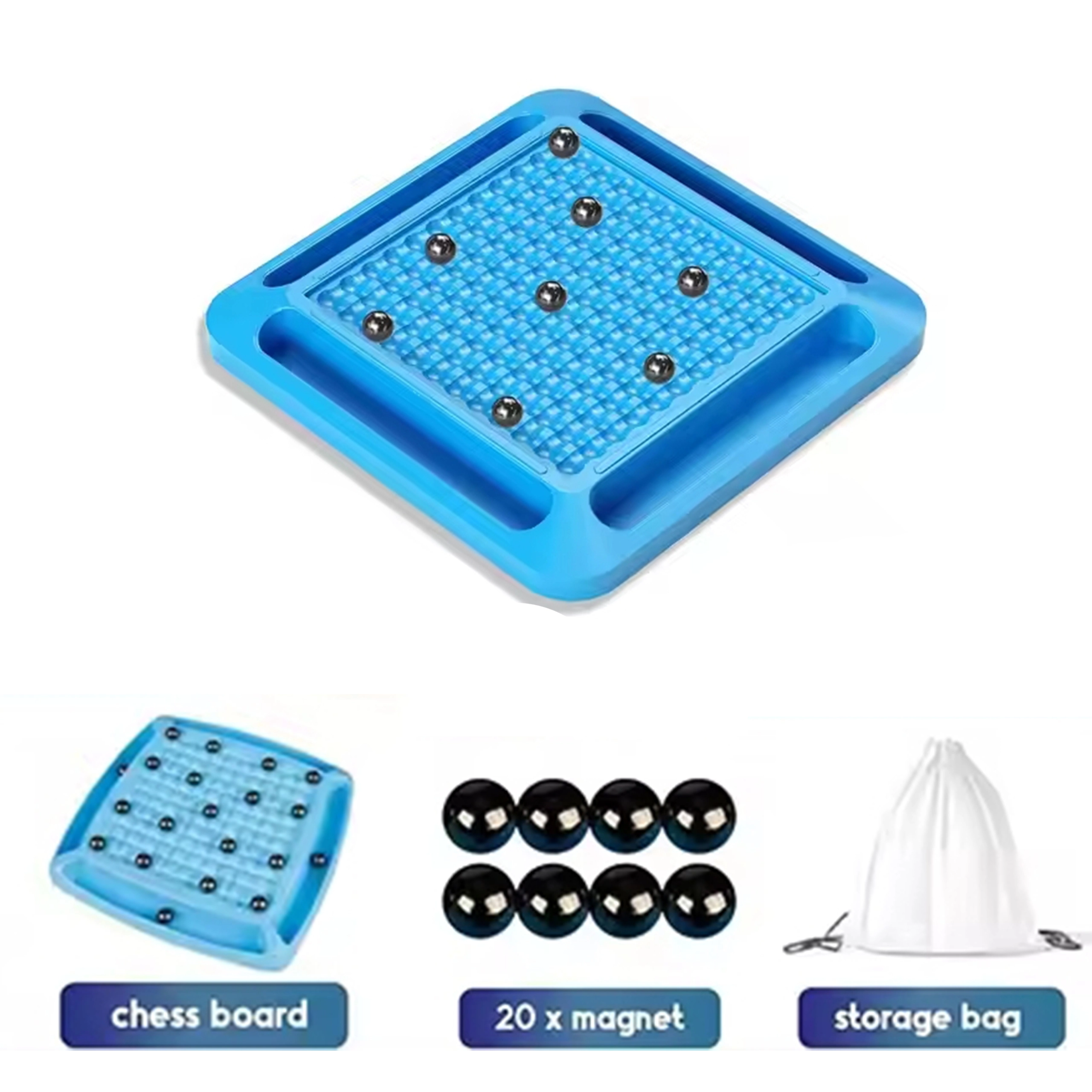 - Kvalitatīvas komponentes: stingra plastmasas pamatne, 20 magnētiskas lodītes un ērts maisiņš.