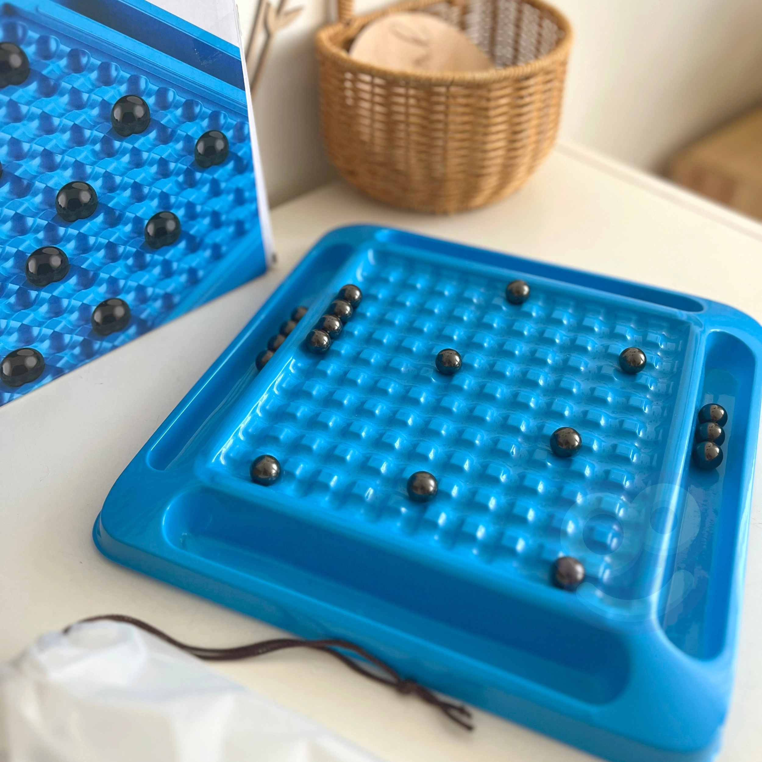 - spēles pamatne ar režģi un 4 nodalījumiem, 20 magnētiskas lodītes, maisiņš lodītēm