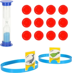 - 2 galvas stīpas, ilustrētas kartītes, smilšu pulkstenis, žetoni