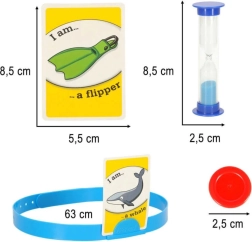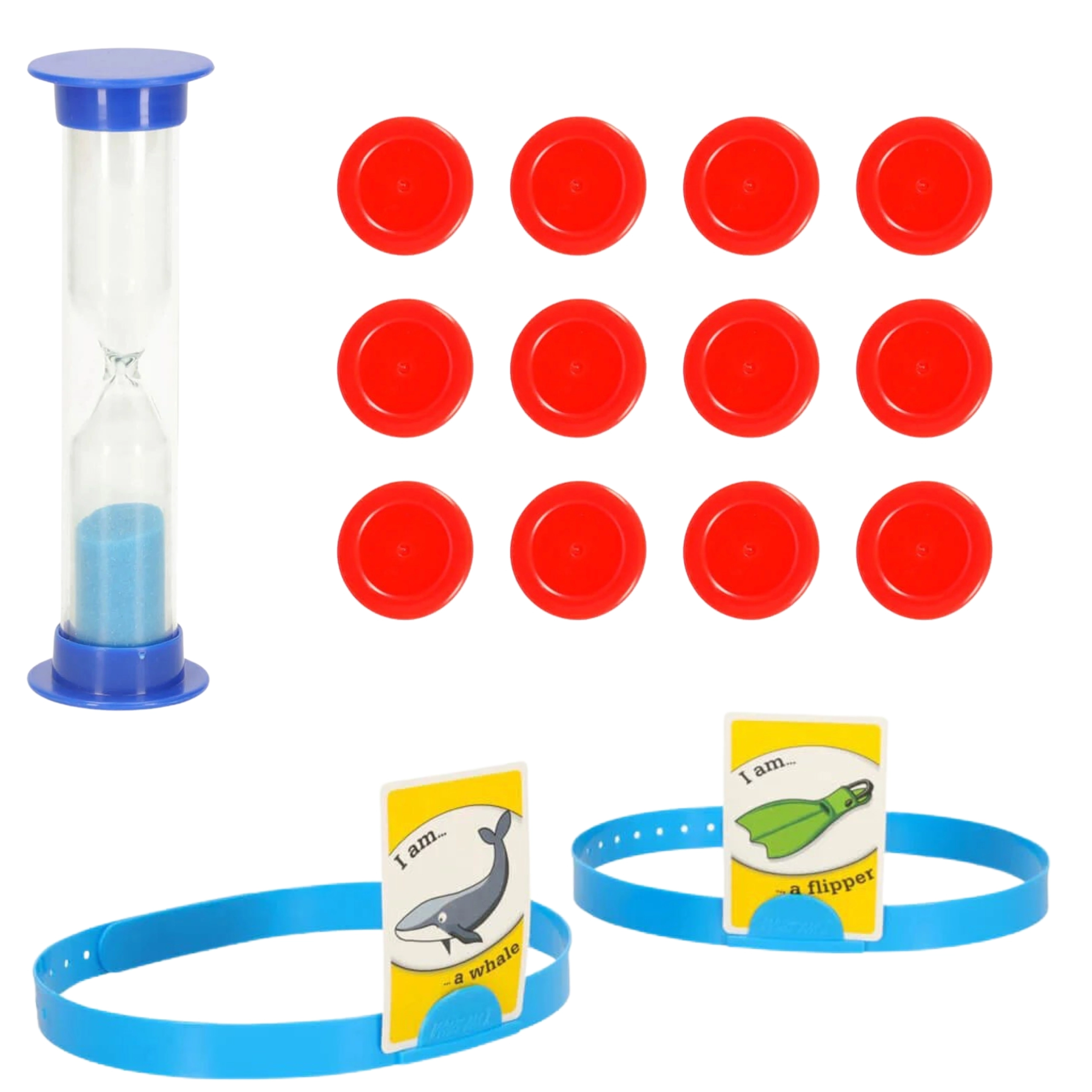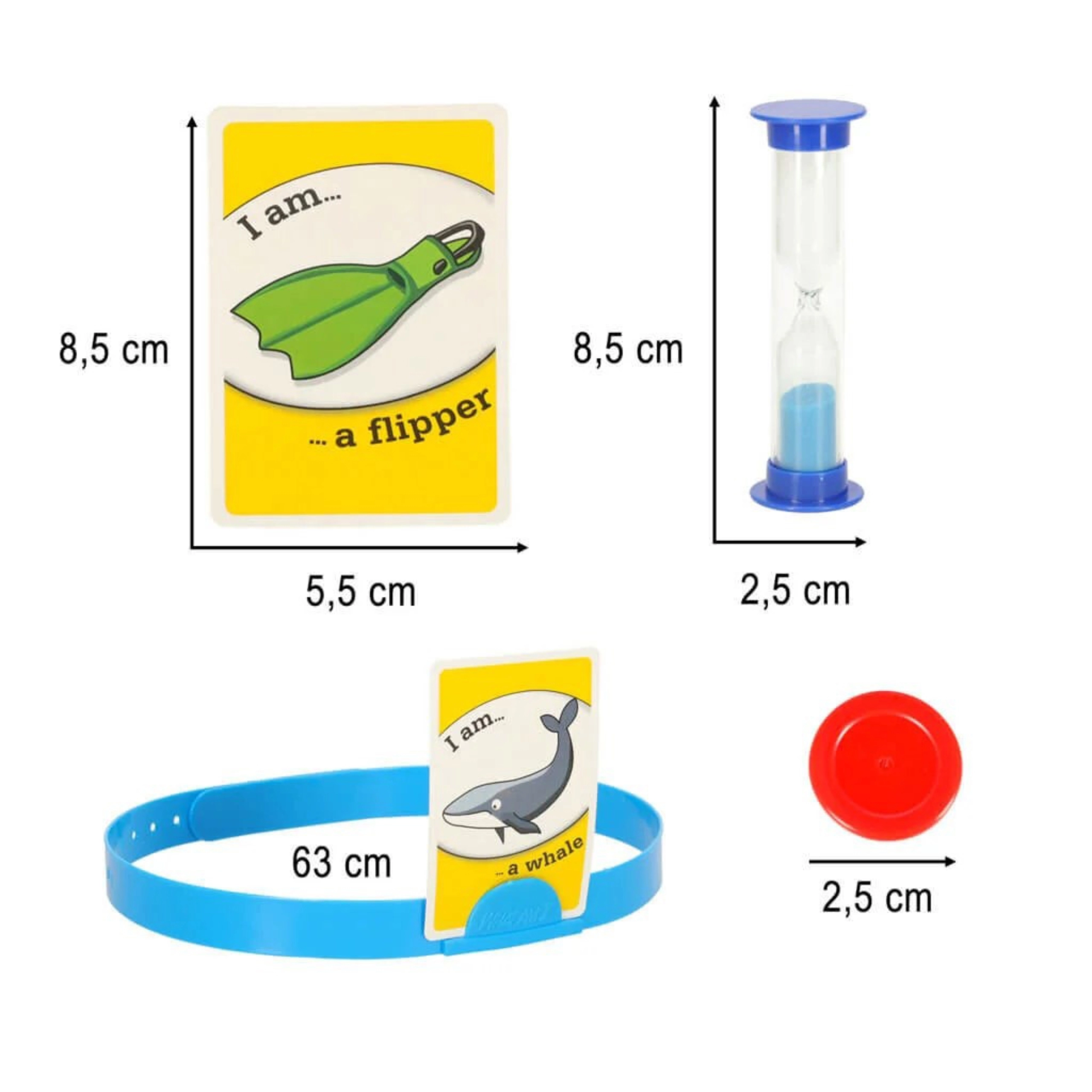Izturīgās galvas stīpas ērti notur kartīti uz galvas, smilšu pulkstenis piešķir raundiem tempu, bet žetoni palīdz sekot līdzi punktiem. Ideāls komplekts raitai un aizraujošai spēlei divatā.