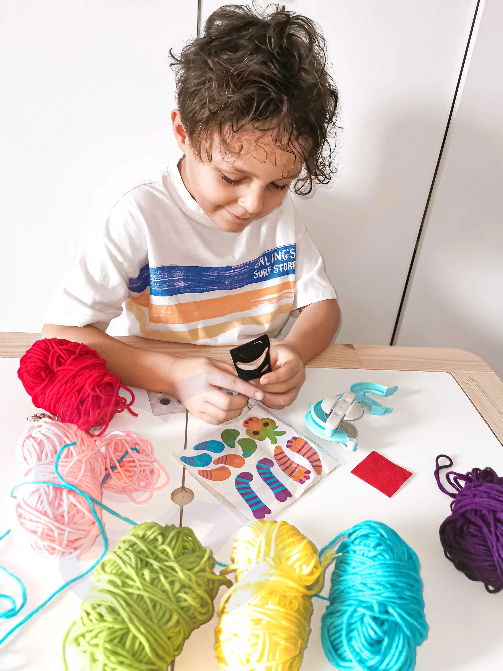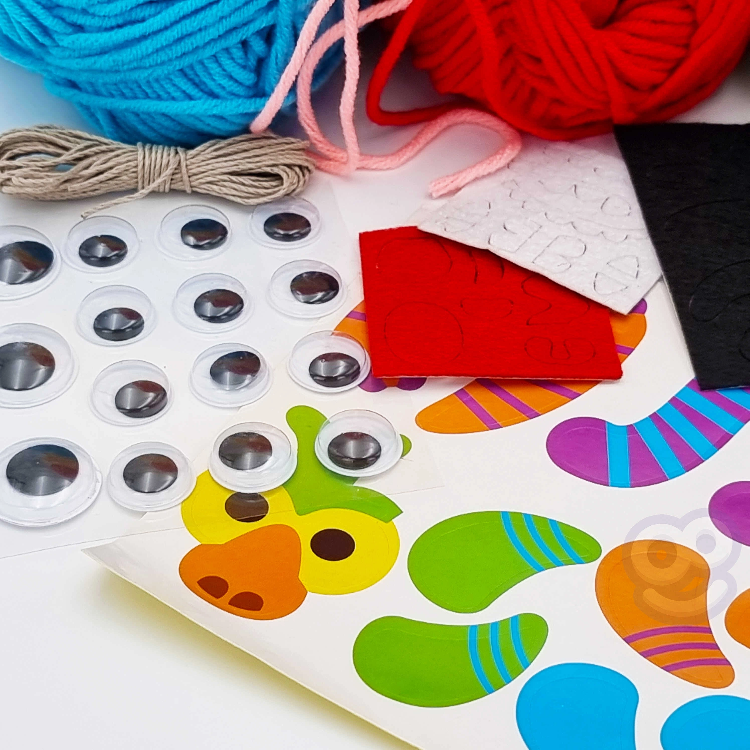 Komplektā ir 6 dažādkrāsaini diegi, kas ļauj bērniem veidot krāsainas briesmonītes.
