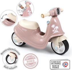 Smoby rozā skūteris piedāvā vairākas funkcijas pašiem mazākajiem ceļotājiem. Tam ir ērts sēdeklis ar glabāšanas nodalījumu rotaļlietām, bet aizdedzes atslēga izdod mehānisku skaņu. Ideāli piemērots mazajiem atklājējiem!