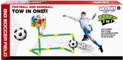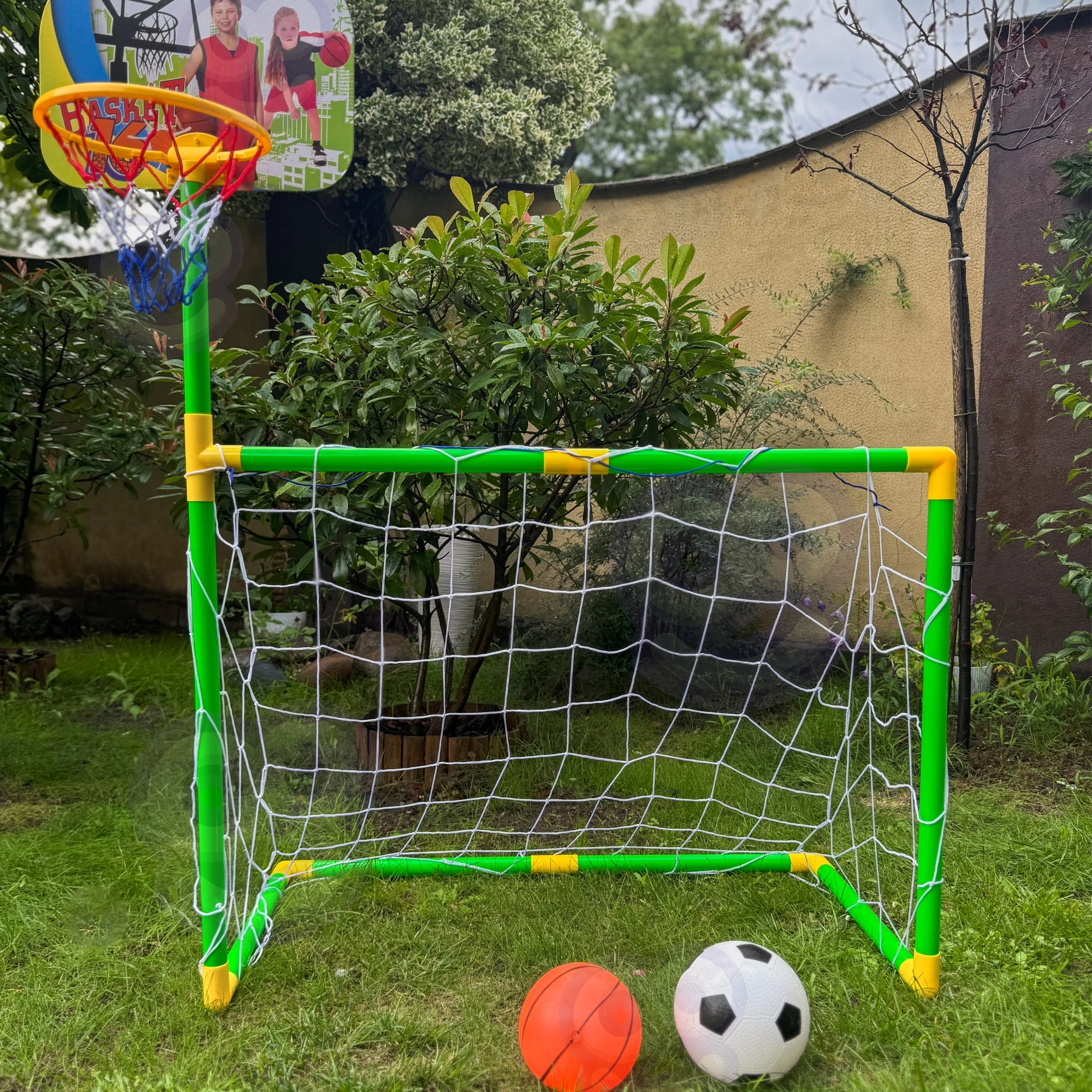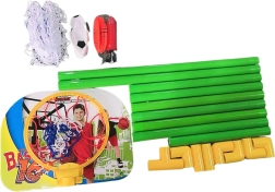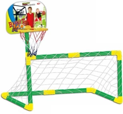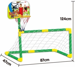 Komplektā: futbola vārti ar tīklu, basketbola grozs, futbola bumba, basketbola bumba, mazais pumpis.
