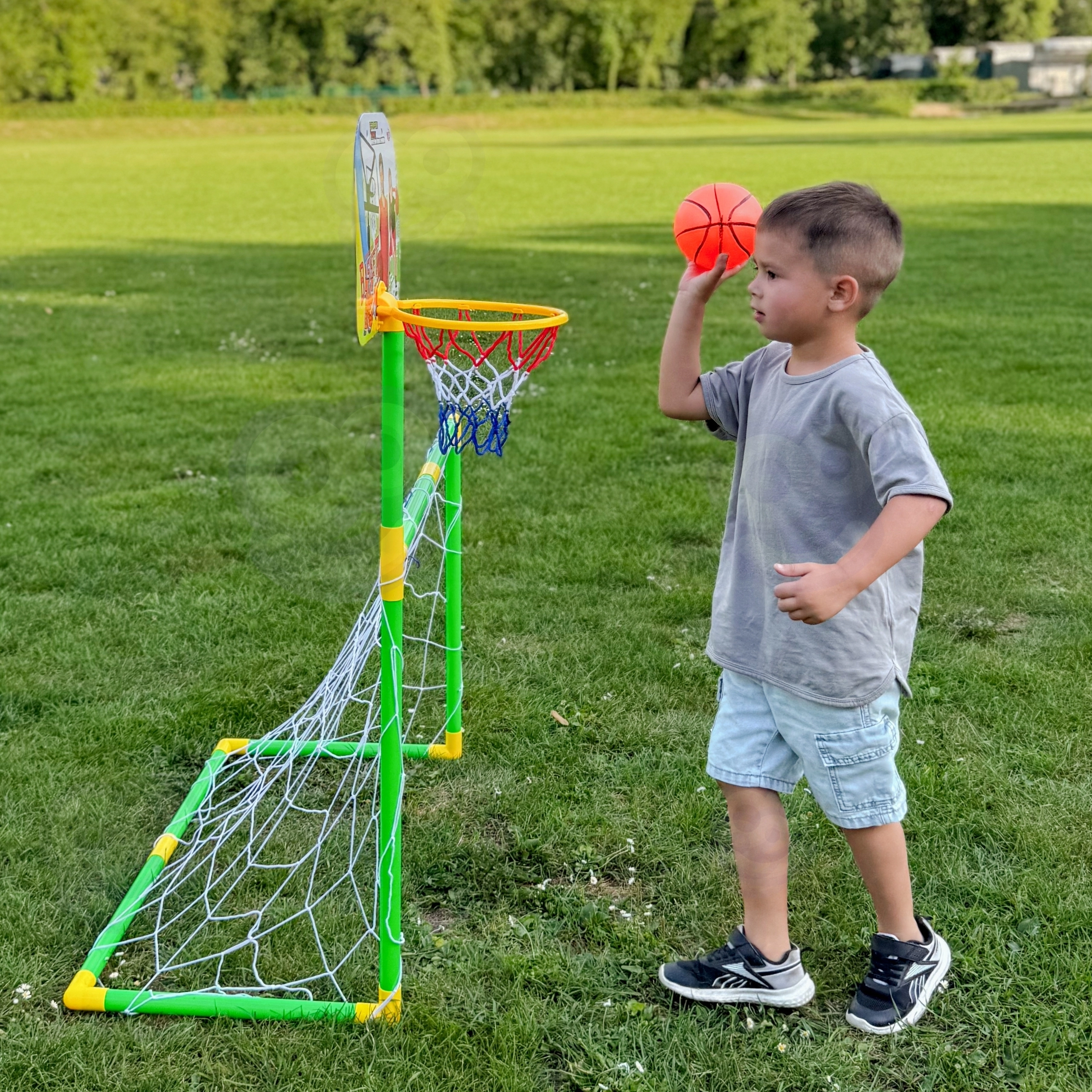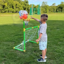 Sporta komplekts Woopie 2in1 sniedz izklaidi un kustību ikdienai. Pateicoties basketbola groza un futbola vārtu kombinācijai, bērniem nekad nav garlaicīgi, un viņi dabiski apgūst koordināciju, līdzsvaru un komandas spēli. Vārtu augstums ap 124 cm ir ideāls mazākiem bērniem, bet droši, bērniem draudzīgi materiāli nodrošina bezrūpīgu spēli.