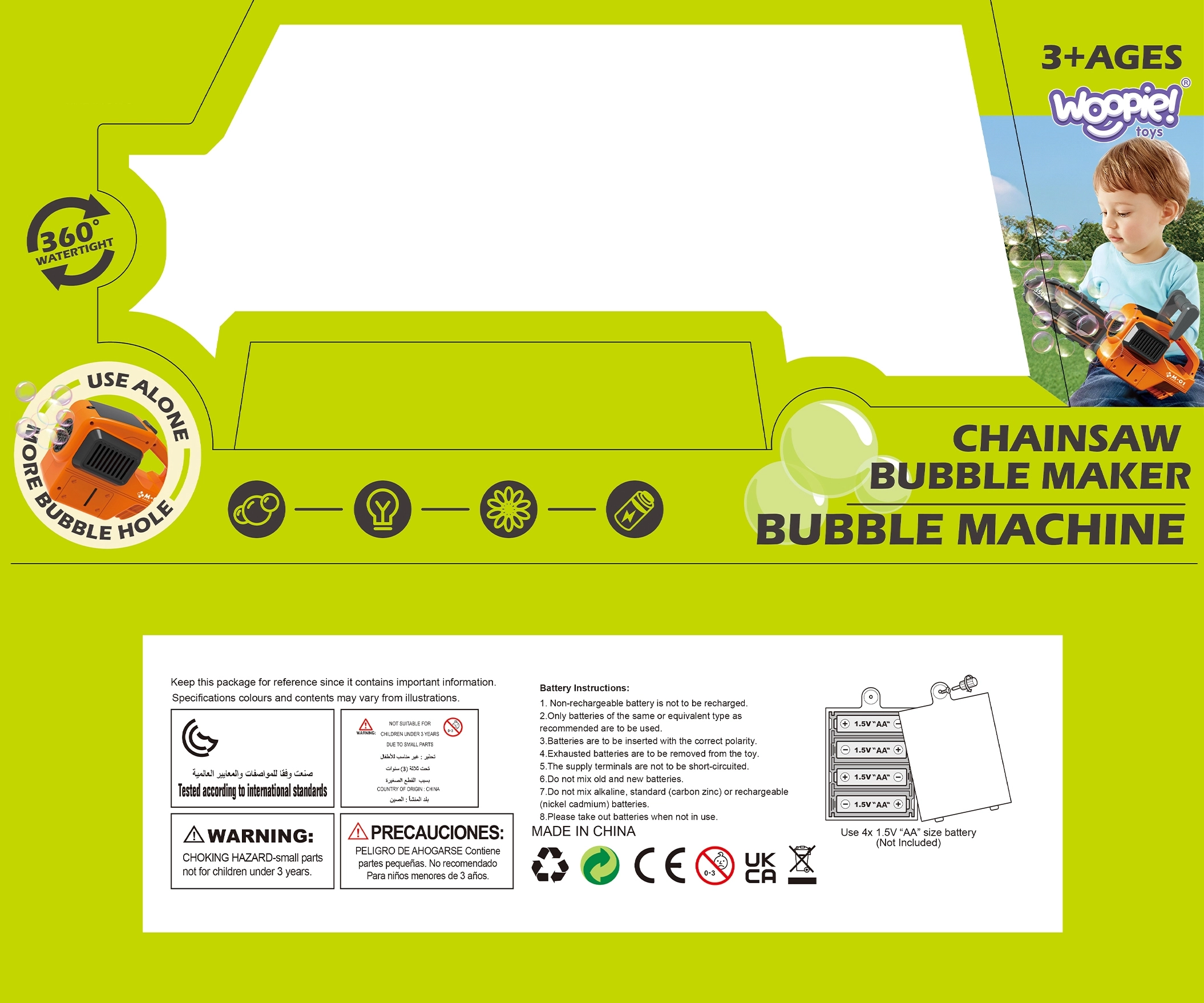 Izklaidējošā WOOPIE zīmola burbuļu pistole zāģa formā pārvērtīs katru pēcpusdienu dārzā par izrādi, kas pilna ar burbuļiem. Pateicoties noņemamajam “asmens” uzgalim, izskatu var ātri mainīt uz stilīgu burbuļu ģeneratoru, bet automātiskā pūšana, gaismas efekti un 360° rotējoša izvade rada iespaidīgu vizuālu skatu. Iepakojumā ir 2 pudelītes ar šķīdumu; rotaļlieta ir vieglā, pārnēsājamā un ideāli piemērota bērniem no 3 gadu vecuma.