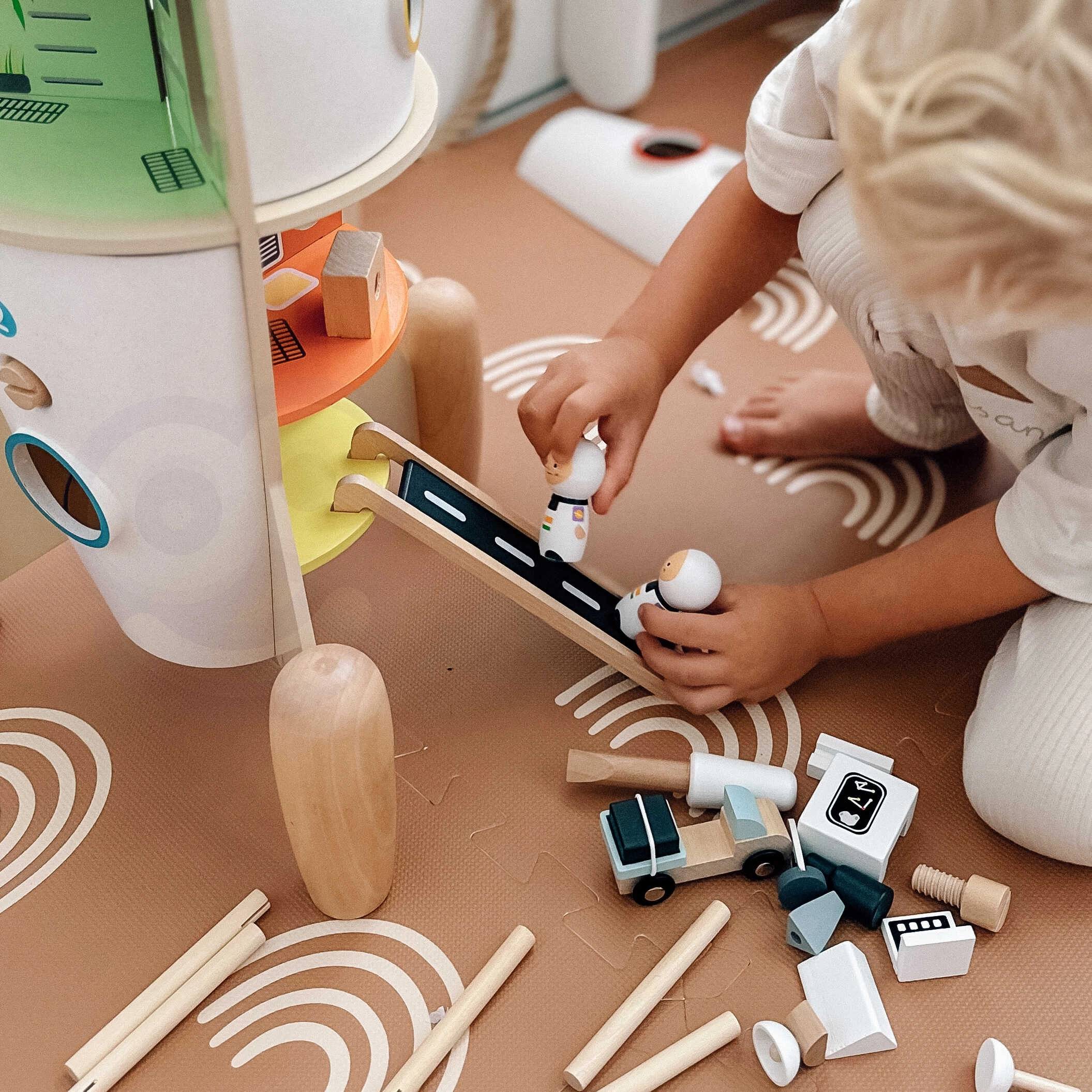 Rotaļlieta ir galvenokārt izgatavota no koka, papildināta ar kvalitatīvu plastmasu un apstrādāta ar netoksisku laku. Tā ir izturīga, estētiski veidota un radīta ilgstošai spēlei bērnu istabā. Veicina iztēli, radošumu un sīko motoriku.