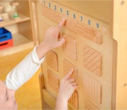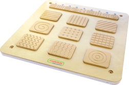 Šī koka maņu tablo piedāvā bērniem drošu un iedvesmojošu vidi pasaules iepazīšanai ar taustes palīdzību. Spēle notiek tā, ka bērns ar aizvērtām acīm vispirms izpēta mazo teksturēto flīzīti un pēc tam meklē tās atbilstību starp deviņām lielākām. Dabiskā veidā tiek stiprināta maņu integrācija, koncentrēšanās un salīdzināšanas prasmes.