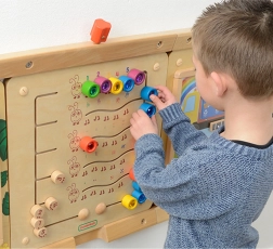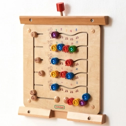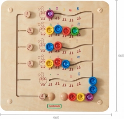 Pa kreisi atradīsiet bīdāmus slēdžus uzdevumu iestatīšanai – bērni var trenēt skaitīšanu augšup un lejup līdz 5, piesaistīt daudzumus un krāsas, kā arī vingrināt loģisko domāšanu. Papildus sīkās motorikas un roku–acu koordinācijas attīstīšanai rotaļlieta palīdz arī koncentrēties un pilnveido vizuālo uztveri.