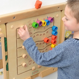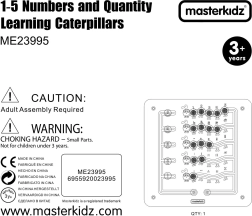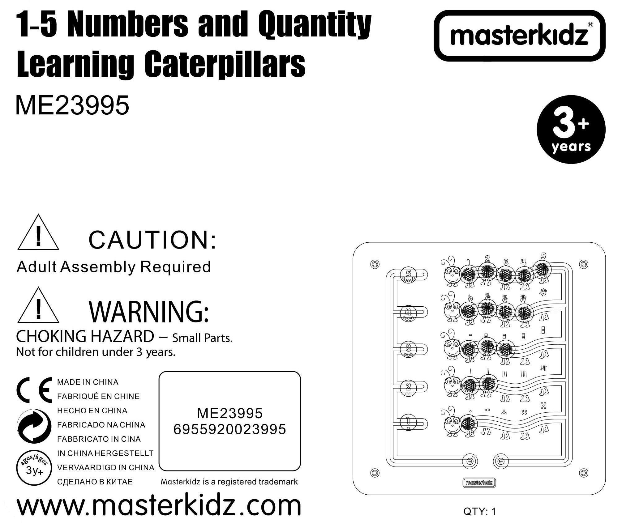 Šī robustā koka sienas tāfele MASTERKIDZ attēlo piecas krāsainas kāpuriņas un 15 bīdāmus “dārgakmeņus” piecās krāsās. Bērni tos var pārvietot pa līkumainiem celiņiem, taču izņemt nevar, kas nodrošina drošu un ilgstošu spēli gan mājās, gan bērnudārzos. Tāfele rāda piecus veidus, kā attēlot skaitļus 1–5: cipari, pirksti, svītras, bloki un punkti.