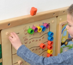 Praktiska montāža pie sienas nodrošina stabilitāti, drošību un kārtību. Bērni var ērti koncentrēties uz aktivitāti stāvus pozā.