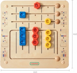 Šī kvalitatīvā izglītojošā tāfele MASTERKIDZ ir sadalīta divās daļās: augšējā josla ar uzdevumiem, kur bērni pieskaņo trīs formas (sarkans sešstūris, zils kvadrāts, dzeltens riņķis), un apakšējā daļa ar trim kolonnām un 9 formām šķirošanai. Pateicoties krāsainajiem rokturiem, bērni vienlaikus vingrina arī krāsu atpazīšanu. Visi gabaliņi ir integrēti tāfelē – tie viegli bīdās, bet neizkrīt un nezūd.