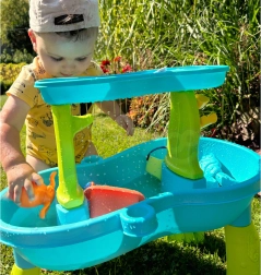 Satur dažādas faktūras un stimulējošus elementus, kas rosina bērnus atklāt ūdens un smilšu pasauli.