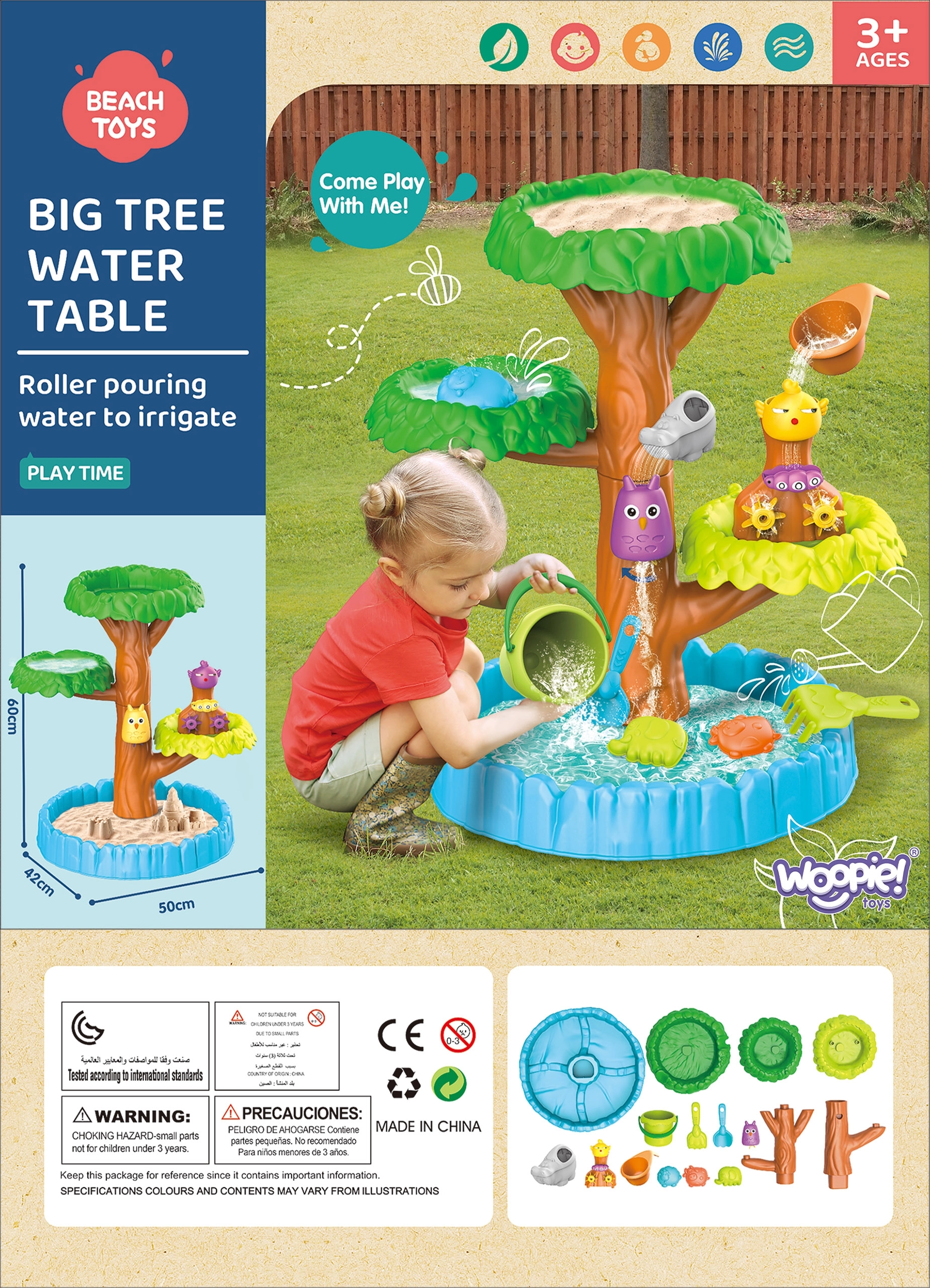 Ūdens galds koka formā no zīmola Woopie ir ideāli piemērots spēlēm ar ūdeni un smiltīm. Šajā komplektā ir viss nepieciešamais bezgalīgai izklaidei – saliekams galds, spainis, lejkanna, trīs formiņas, divas lāpstiņas, krūka. Bērns var aplaistīt ar ūdeni dažādus dzīvnieciņus, kas liek zobratu riteņiem griezties, tādējādi piešķirot vēl vairāk prieka jau tā lieliskajai nodarbei.