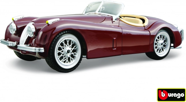 Bburago Jaguar XK 120 Roadster (1951) modelis mērogā 1:24 piedāvā leģendāru britu roadsteru stilīgā sarkanā krāsā. Ticamas virsbūves līnijas, autentiski interjera elementi un kvalitatīvs krāsojums izceļ automobiļa eleganci, kas savā laikā bija viens no ātrākajiem sērijveida auto.