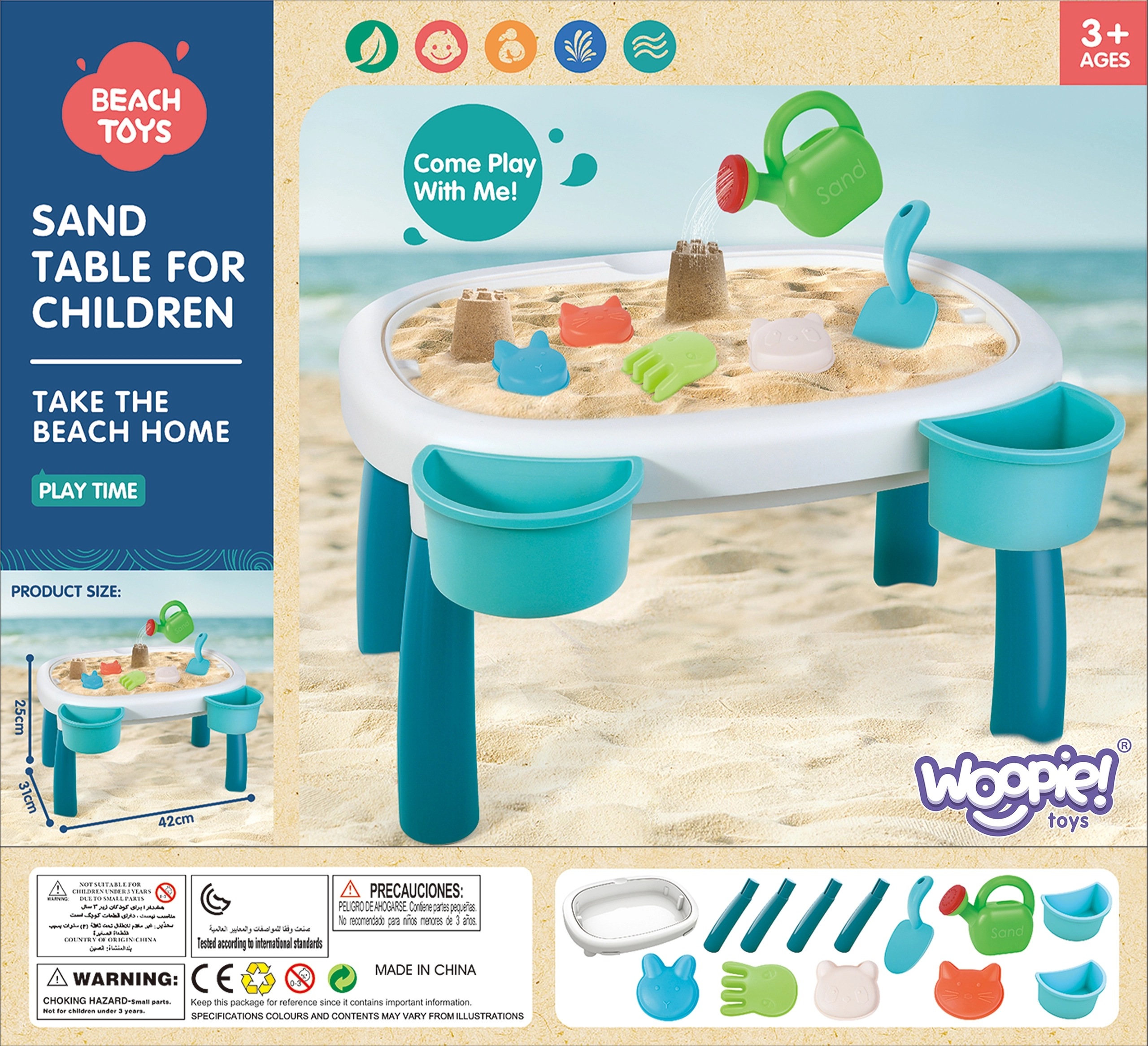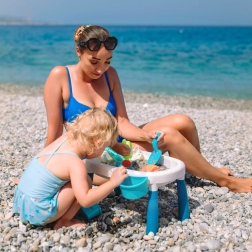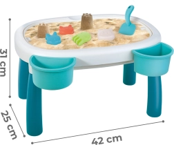 Iepakojumā ir 7 praktiski piederumi – lejkanna, lāpstiņa, 4 formiņas (astoņkājis, kaķis, panda, trusītis) un divi ieliktņi galdam. Ar tiem bērni var veidot smilšu būves, pārliet ūdeni un attīstīt radošumu un manuālās prasmes.