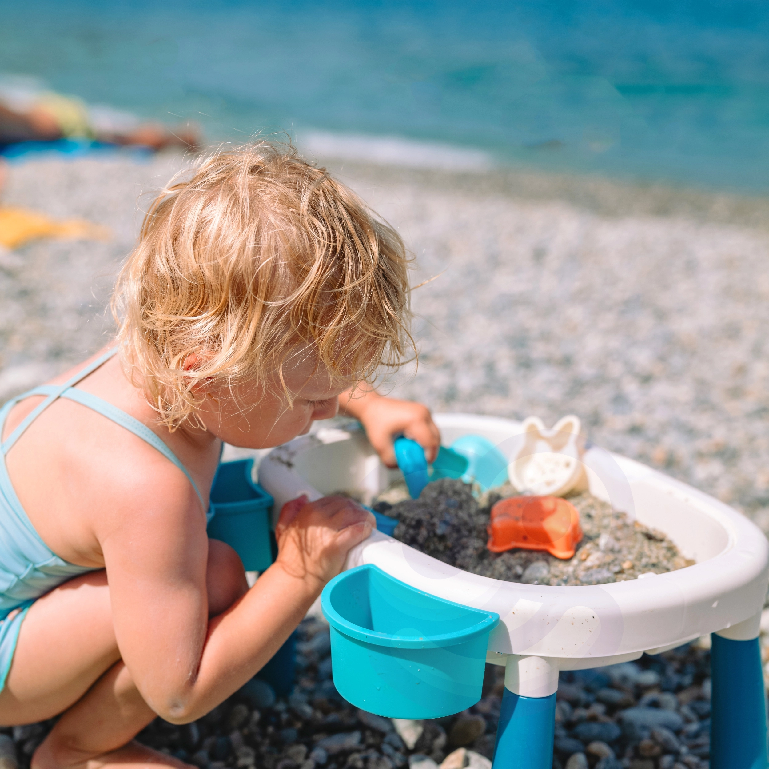 Divas atsevišķas nodalījumu daļas ļauj apvienot ūdens eksperimentus un smilšu būves vienā kompaktā galdā – ideāli visa gada garumā.