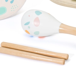 Komplektā ir pieci instrumenti: zvārguļi, rumba bumbiņas, bungas un divi vālīšu kociņi – ideāli mūzikas atklāšanai.