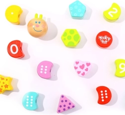 Numurētie un dažādu formu klucīši tiek vērti uz aukliņas, un bērni dabiski trenē skaitīšanu, kārtošanu un secību. Ideāli pirmajiem soļiem matemātikā.