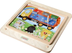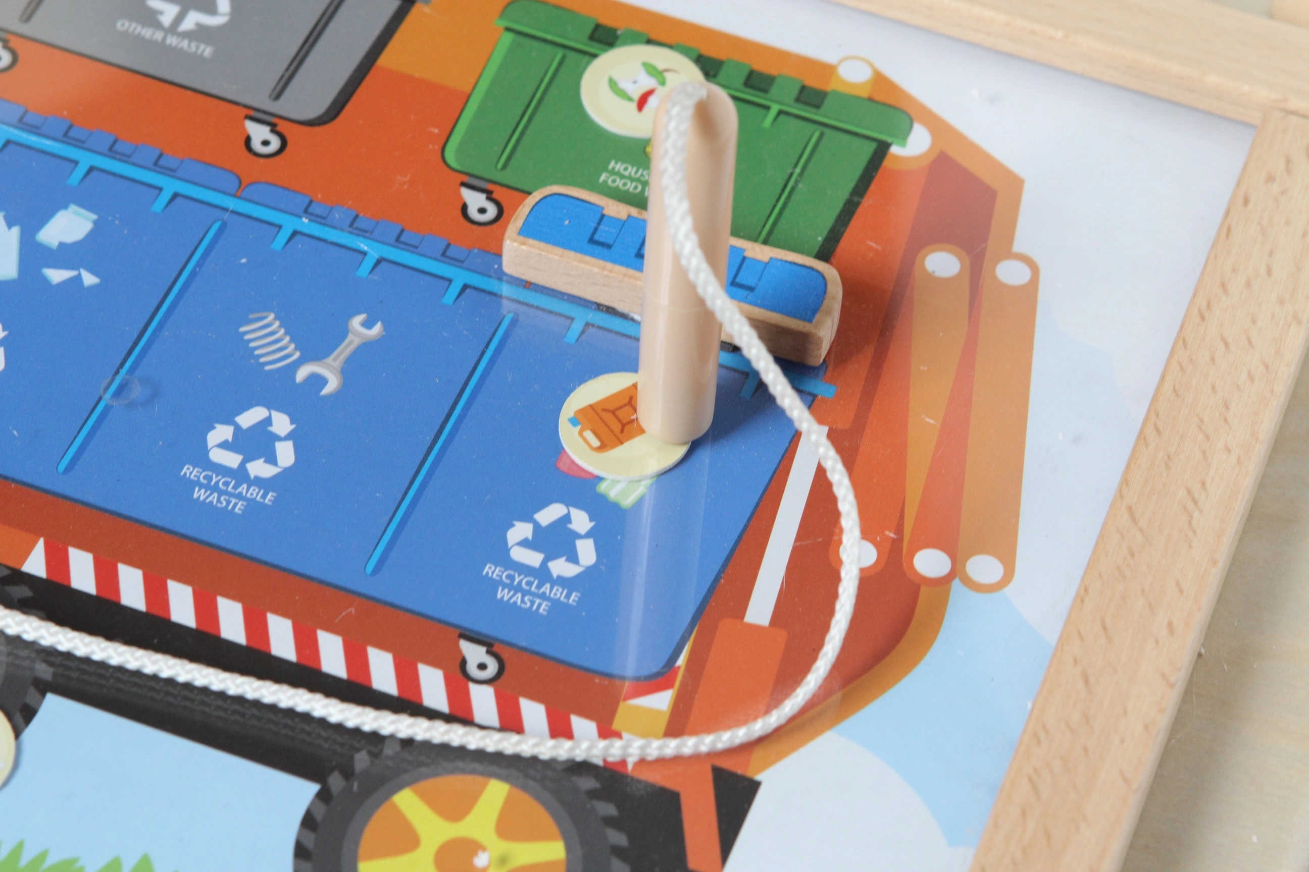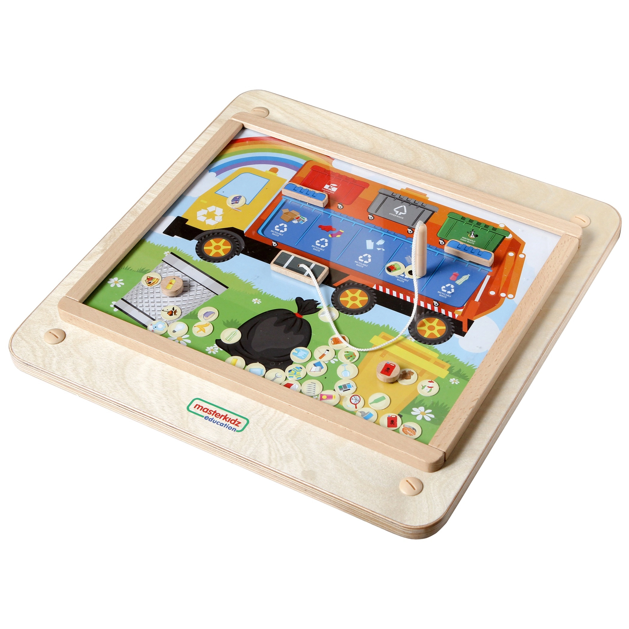 Interaktīvā koka tāfele no Masterkidz māca bērniem šķirot atkritumus jautrā veidā, iedvesmojoties no Montessori metodes. Bērns ar magnētiska/virzoša rīka palīdzību pārvieto atkritumu piktogrammas uz pareizi iekrāsotajiem konteineriem uz tāfeles ar savākšanas auto. Attīsta sīko motoriku, acu–roku koordināciju, koncentrēšanos un vides apziņu. Var lietot gan pie sienas rāmī, gan atsevišķi uz galda vai grīdas.