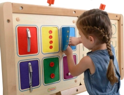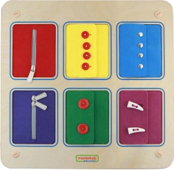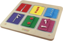 Seši tekstila paneļi uzticami atdarina jakām un krekliem raksturīgās aizdares. Bērni droši izvingrina rāvējslēdzējus, pogas un spiedpogas, pirms tos lieto ikdienā.