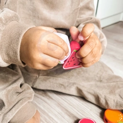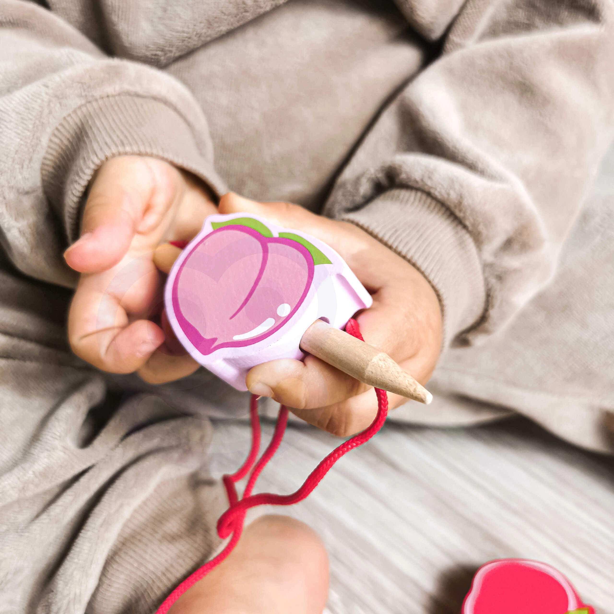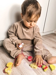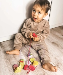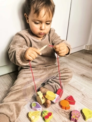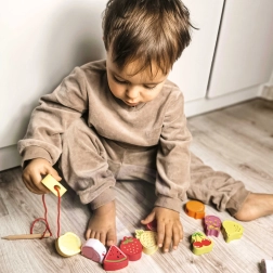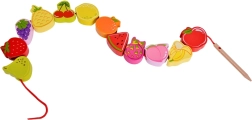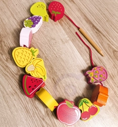 Šī koka vēršanas spēle ar augļu motīviem ir ideāls palīglīdzeklis mazajiem pētniekiem no 18 mēnešu vecuma. Ar koka adatas palīdzību bērni ver krāsainos augļus uz auklas, dabiski attīstot sīko motoriku, pacietību un loģisko domāšanu. Vienlaikus rotaļīgi apgūst krāsas un augļu nosaukumus.