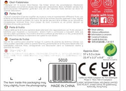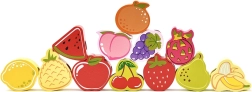 Komplektā ir košas zemenes, banāna, vīnogu un citu augļu formas. Spēlējoties bērni apgūst krāsu atpazīšanu un augļu nosaukumus.