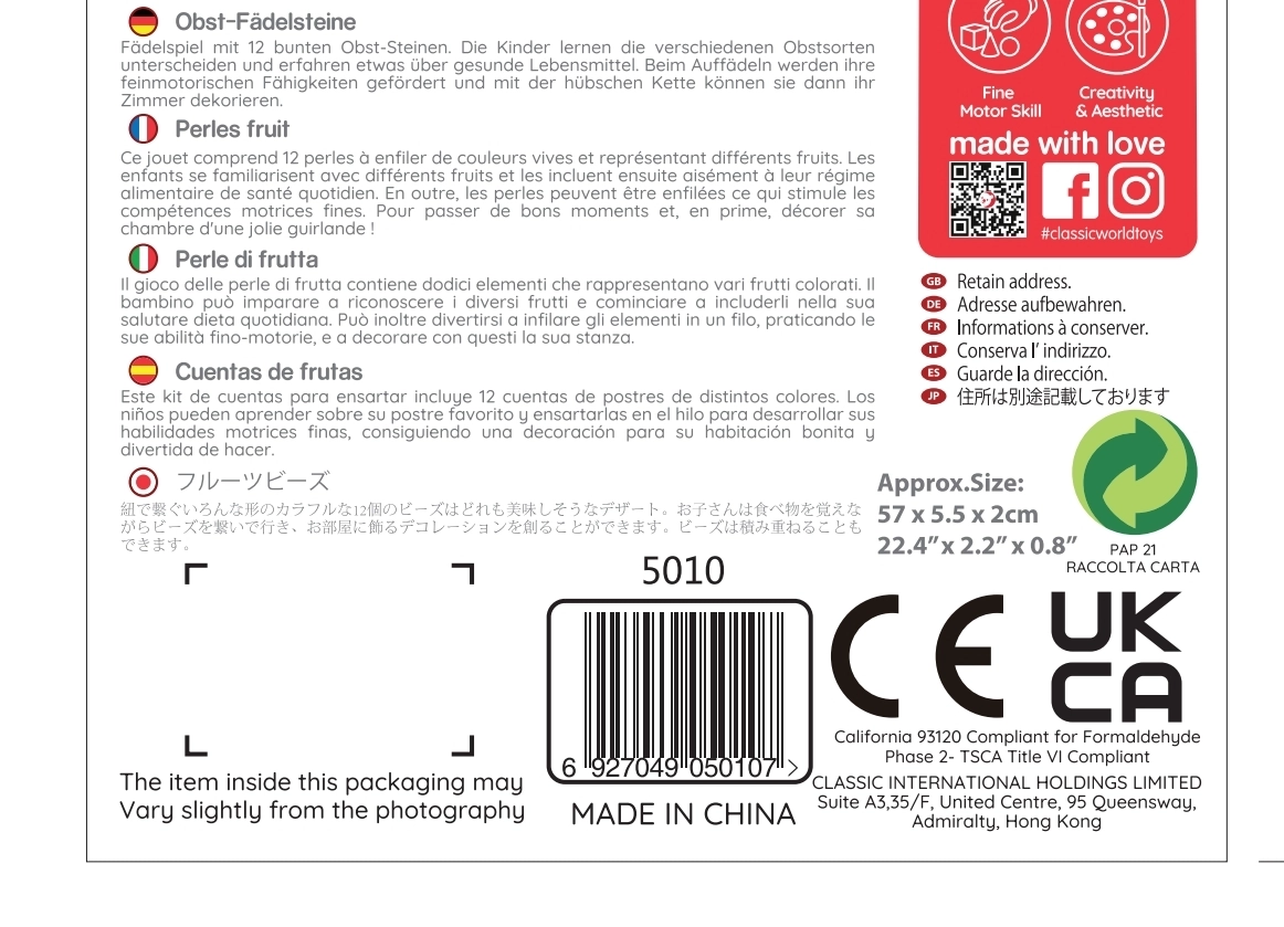 Komponentes ir izgatavotas no kvalitatīva lakota koka un krāsotas ar drošām, netoksiskām krāsām. Komplekts ir izturīgs, patīkams taustei un veicina radošu un atvērtu spēli – krelles var kārtot jebkurā secībā un veidot savas “augļu virtenes”.