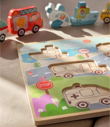 Šis koka Montessori ieliktnis piedāvā bērniem aizraujošu mācīšanos rotaļājoties. Komplektā ir robusta pamatne ar izgriezumiem un 7 transportlīdzekļu gabaliņi (piem., auto, taksometrs, policija, ātrā palīdzība, ugunsdzēsēji, lidmašīna, kuģis), kurus bērni pievieno pēc formas un attēla. Pateicoties spilgtām krāsām un skaidriem kontūriem, bērni ātri saprot saskaņošanas principu un ar katru pareizi ievietotu gabaliņu piedzīvo veiksmes sajūtu.