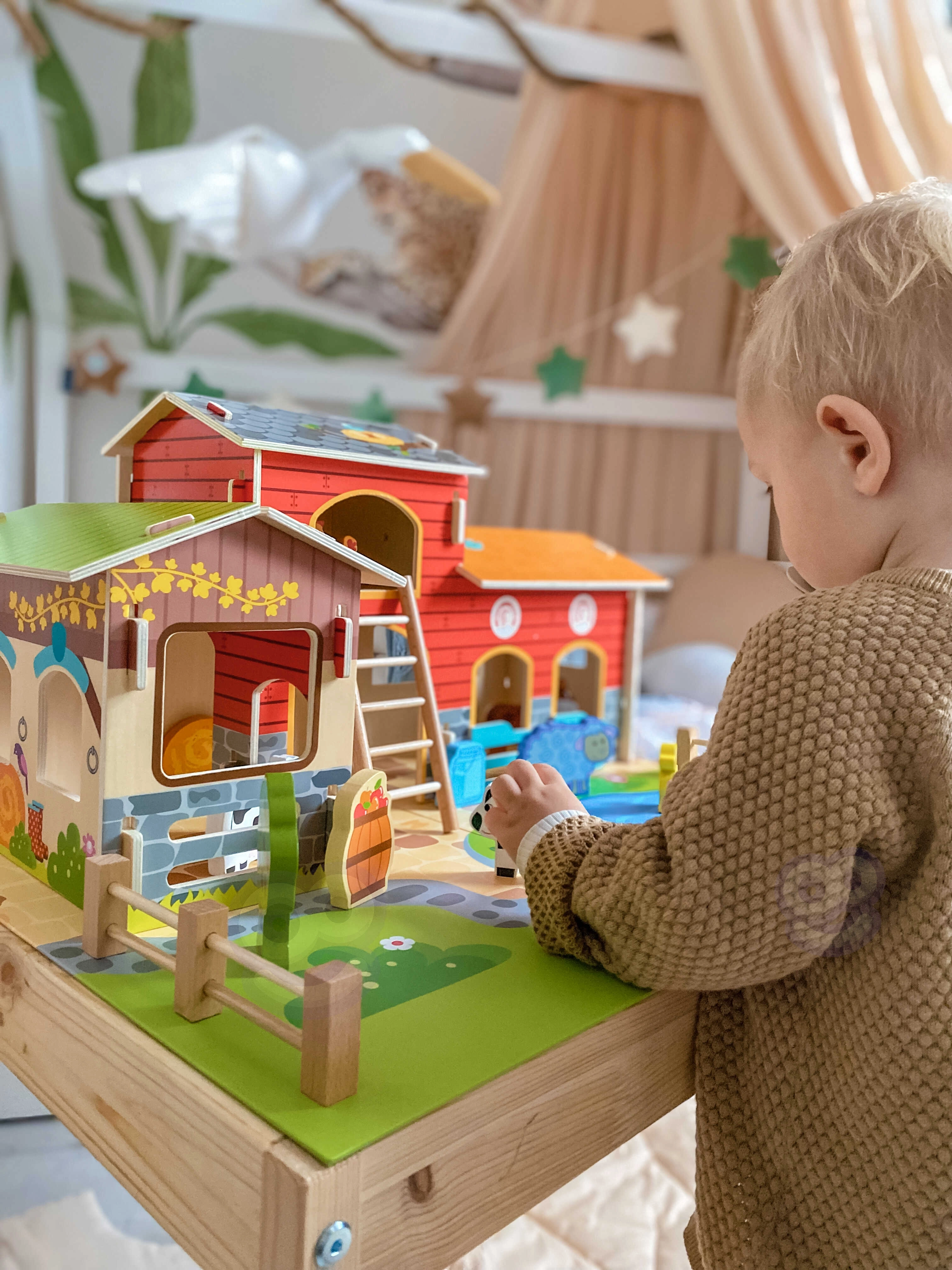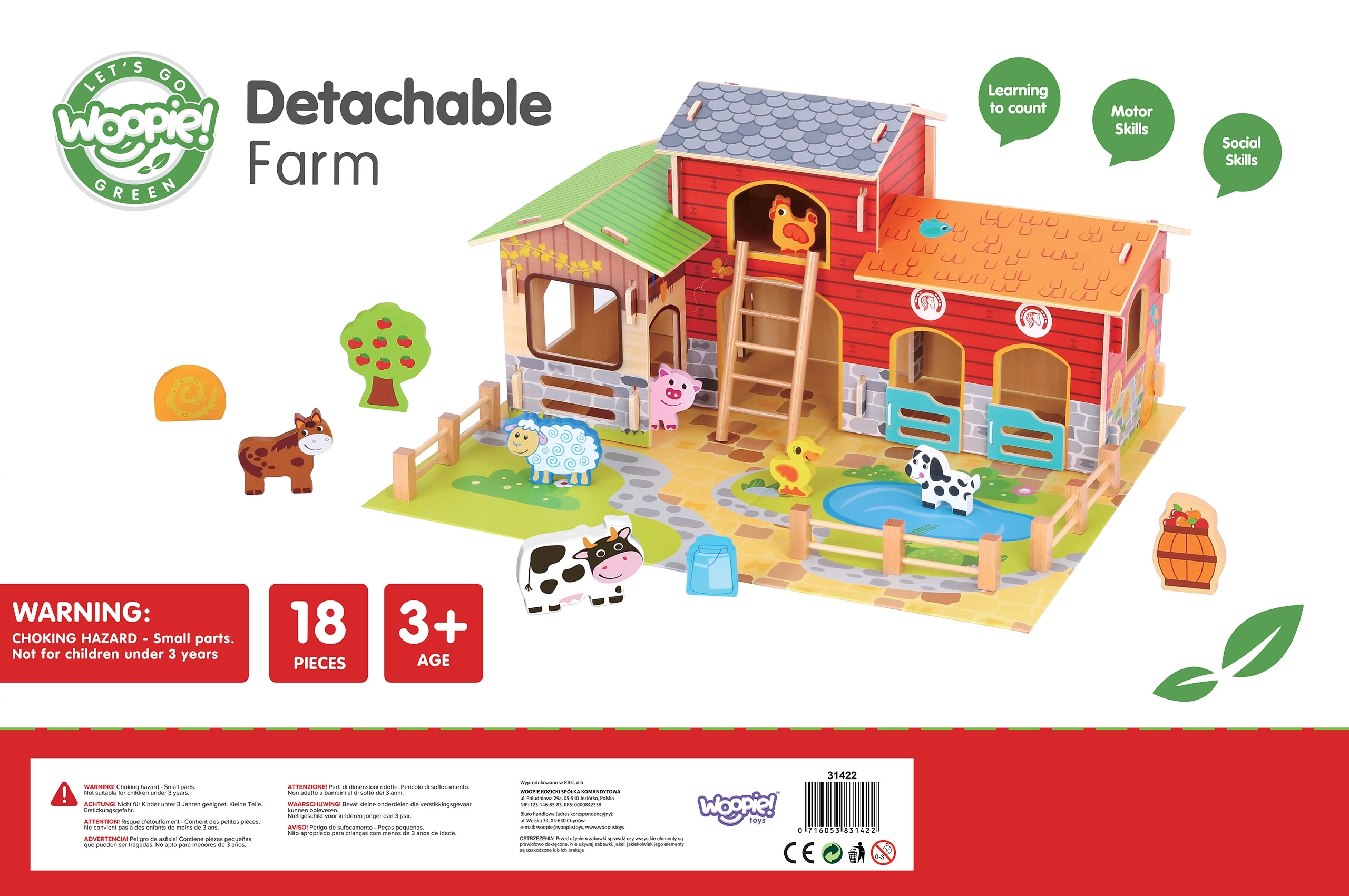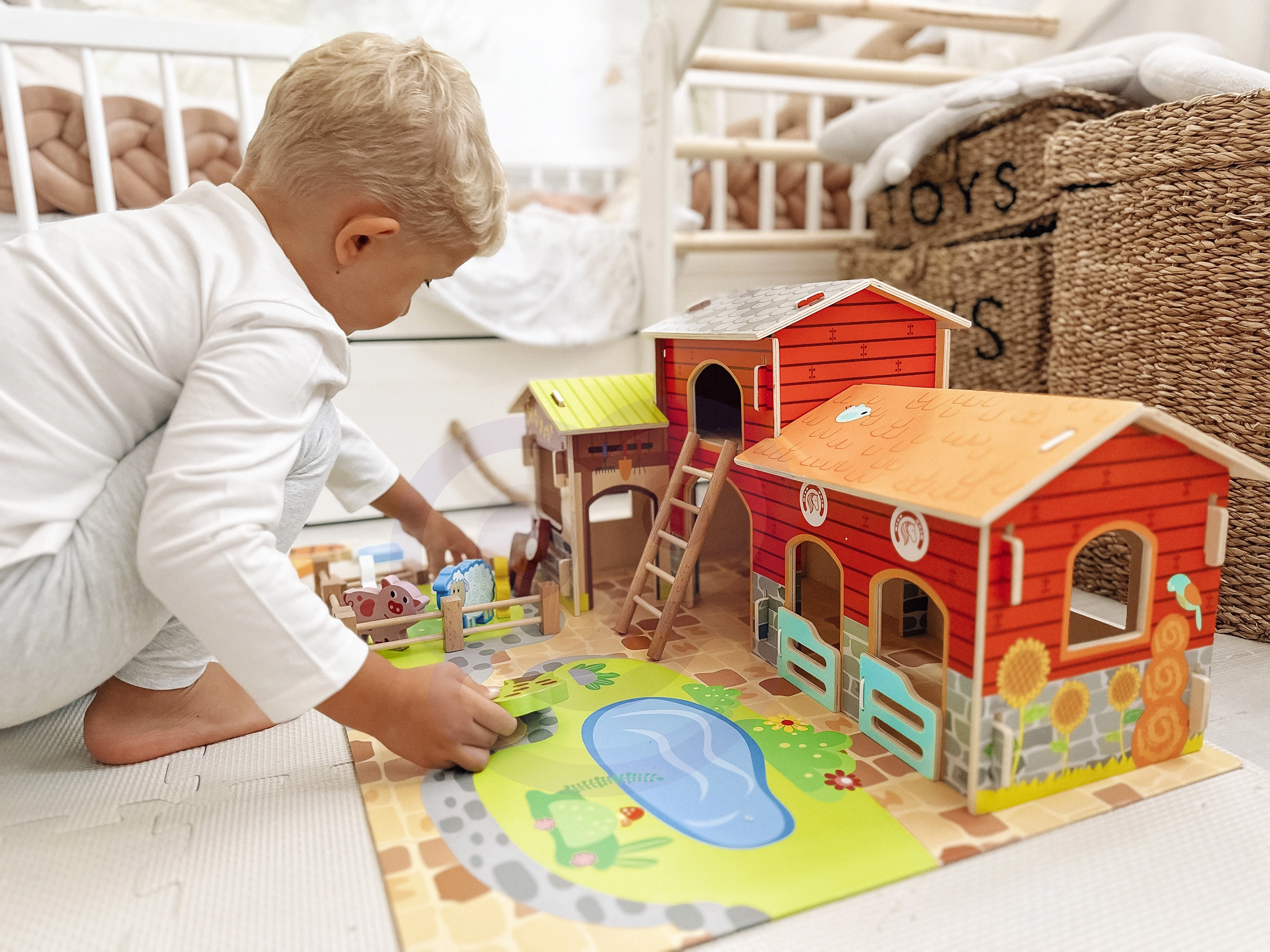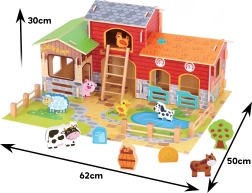 Izveidojiet mājās savu saimniecību! Koka mega ferma WOOPIE GREEN iepazīstina bērnus ar dabas pasauli, kur viņi mācās rūpēties par dzīvniekiem un atklāj ikdienas dzīvi laukos. Reālistiskās ēkas (staļļi, klēts un vistu kūts), dīķis un detalizētās figūriņas veicina radošu stāstīšanu un lomu spēles.