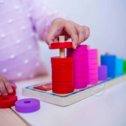 Bērni piešķir krāsainus gredzenus cipariem un intuitīvi mācās skaitīt, atpazīt krāsas un saprast jēdzienus vairāk–mazāk.